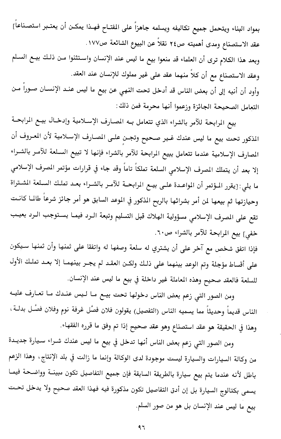 وبعد هذا الكلام ترى أن العلماء قد منعوا بيع ما ليس عند الإنسان واستثنوا من ذلك بيع السلم وعقد الاستصناع مع أن كلاً منهما عقد على غير مملوك للإنسان عند العقد.