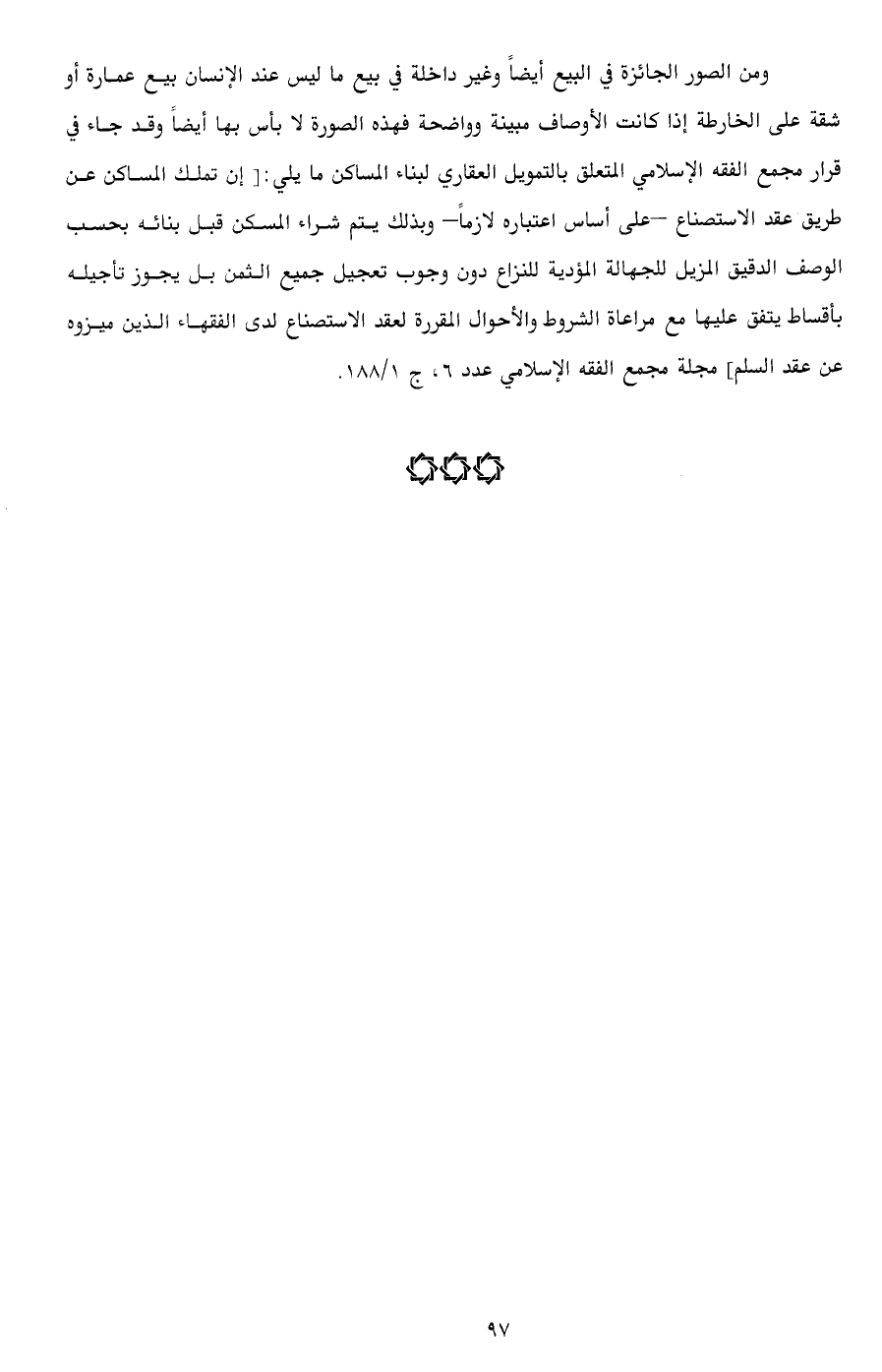 ومن الصور الجائزة في البيع أيضاً وغير داخلة في بيع ما ليس عند الإنسان بيع عمارة أو شقة على الخارطة إذا كانت الأوصاف مبينة وواضحة فهذه الصورة لا بأس بها أيضاً وقد جاء في قرار مجمع الفقه الإسلامي المتعلق بالتمويل العقاري لبناء المساكن ما يلي: [إن تملك المساكن عن طريق عقد الاستصناع –على أساس اعتباره لازماً– وبذلك يتم شراء المسكن قبل بنائه بحسب الوصف الدقيق المزيل للجهالة المؤدية للنزاع دون وجوب تعجيل جميع الثمن بل يجوز تأجيله بأقساط يتفق عليها مع مراعاة الشروط والأحوال المقررة لعقد الاستصناع لدى الفقهاء الذين ميزوه عن عقد السلم] مجلة مجمع الفقه الإسلامي عدد 6، ج 1/ 188.