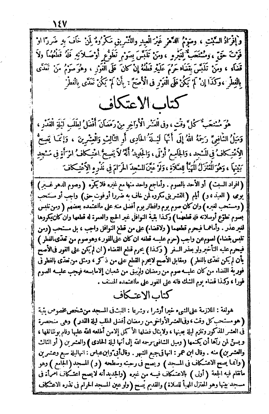 كتاب الِاعْتِكَاف هُوَ لُغَة الْمُلَازمَة على الشَّيْء خيرا أَو شرا وَشرعا اللّّبْث فِي الْمَسْجِد من شخص مَخْصُوص بنية