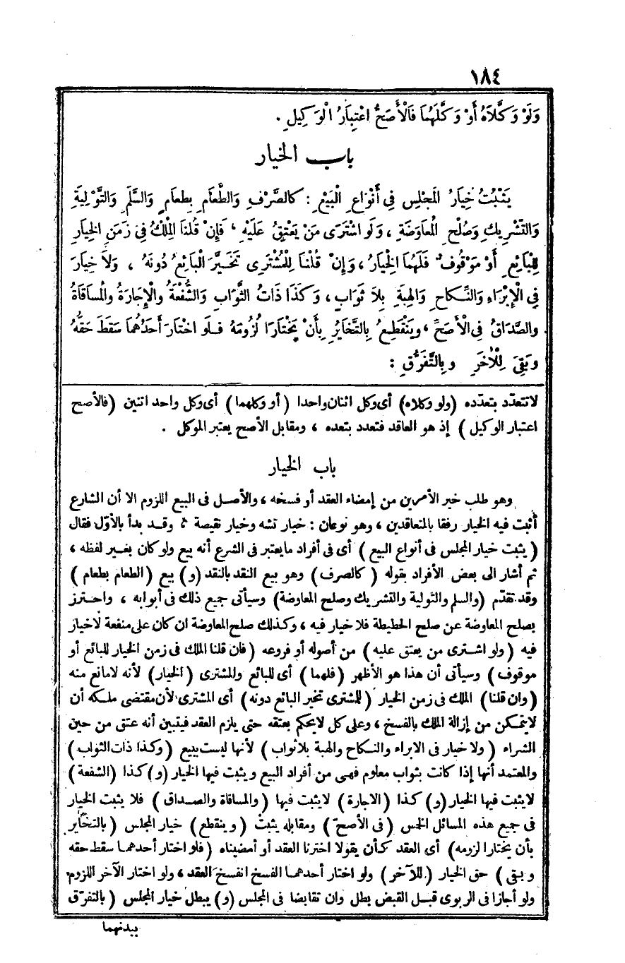 وَهُوَ طلب خير الْأَمريْنِ من إِمْضَاء العقد أَو فَسخه وَالْأَصْل فِي البيع اللُّزُوم الا أَن الشَّارِع أثبت فِيهِ الْخِيَار رفقا بالمتعاقدين وَهُوَ نَوْعَانِ خِيَار تشه وَخيَار نقيصة وَقد بَدَأَ بِالْأولِ فَقَالَ