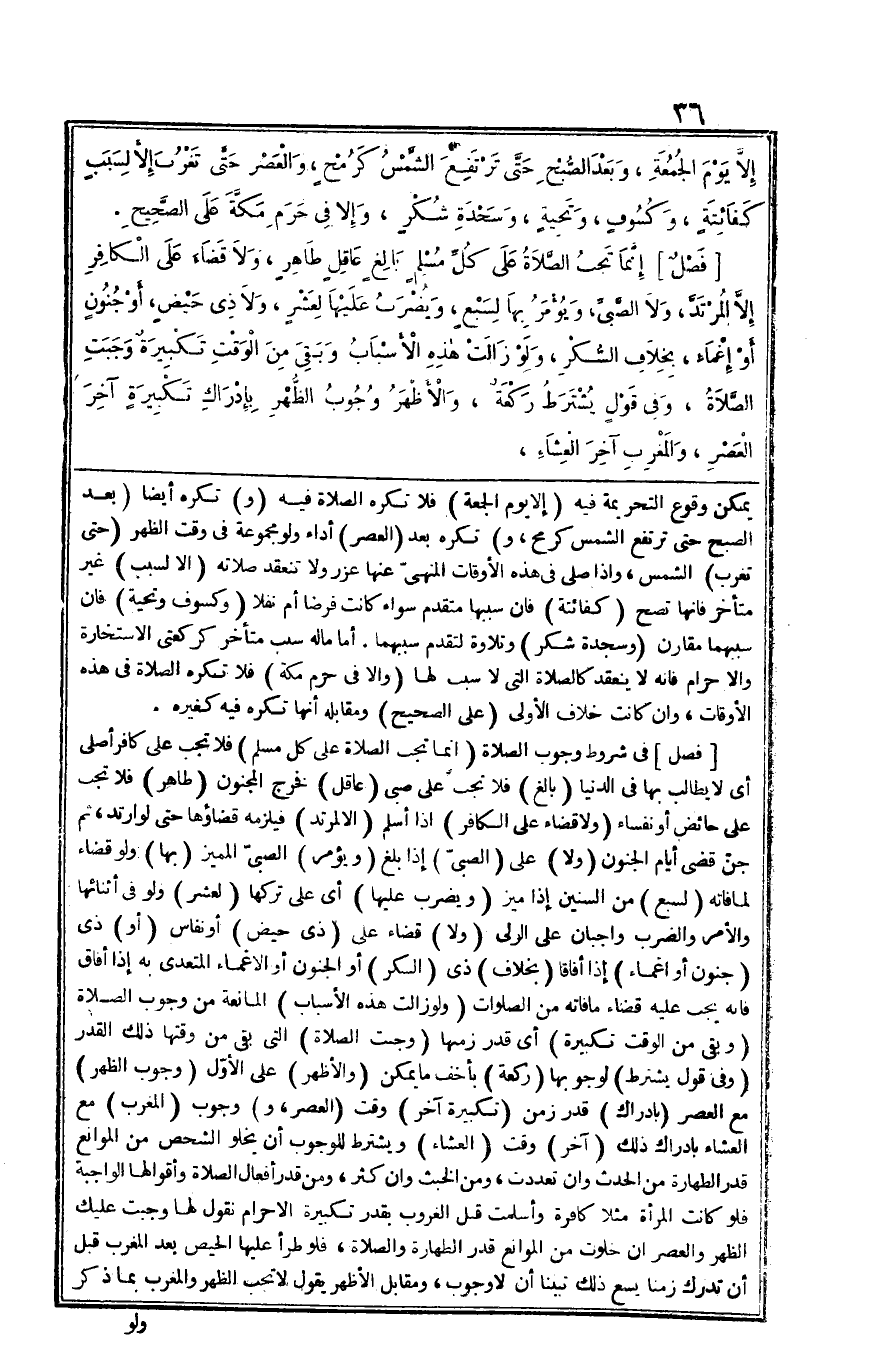 وَيشْتَرط للْوُجُوب أَن يَخْلُو الشَّخْص من الْمَوَانِع قدر الطَّهَارَة من الْحَدث وان تعدّدت من الْخبث وَإِن كثر وَمن قدر أَفعَال الصَّلَاة وأقوالها الْوَاجِبَة فَلَو كَانَت الْمَرْأَة مثلا كَافِرَة وَأسْلمت قبل الْغُرُوب بِقدر تَكْبِيرَة الْإِحْرَام نقُول لَهَا وَجَبت عَلَيْك الظّهْر وَالْعصر إِن خلوت من الْمَوَانِع قدر الطَّهَارَة وَالصَّلَاة فَلَو طَرَأَ عَلَيْهَا الْحيض بعد الْمغرب قبل أَن تدْرك زَمنا يسع ذَلِك تَبينا أَن لَا وجوب وَمُقَابل الْأَظْهر يَقُول لَا تجب الظّهْر وَالْمغْرب بِمَا ذكر