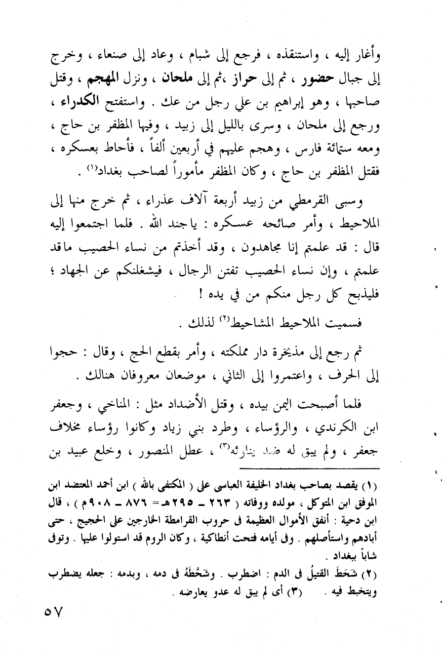وأغار إليه واستنقذه فرجع إلى شبام وعاد إلى صنعاء وخرج إلى جبال حضور ثم إلى حراز ثم إلى ملحان ونزل المهجم وقتل صاحبها هو إبراهيم بن علي رجل من عك واستفتح الكدرى ورجع إلى ملحان وسرى بالليل إلى الزبيد وفيها المظفر بن حاج ومعه ستمائة فارس وهجم عليهم في أربعين ألفا فاحاط بعسكره فقتل المظفر بن الحاج وكان المنصور مأمورا لصاحب بغداد وسبى القرمطي من زبيد أربعة آلاف عذراء ثم خرج منها إلى الملاحيط وأمر صائحه وعسكره يا جند الله يا جند الله فلما اجتمعوا إليه قال قد علمتم أنا مجاهدون وقد أخذتم من نساء الحصيب ما قد علمتم من نساء الحصيب تفتن الرجال فيشغلنكم عن الجهاد فليذبح كل رجل منكم ما في يده فسميت الملاحيط والمشاحيط لذلك. ثم رجع إلى المذيخرة دار مملكته وأمر بقطع الحج وقال: حجوا إلى الحرف واعتمروا إلى الثاني، موضعان معروفان هنالك.