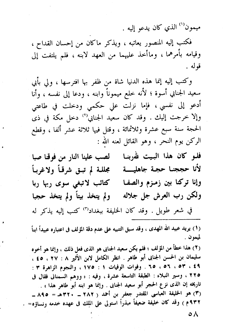 الميمون الذي كان يدعو إليه فيكتب إليه المنصور يعاتبه ويذكره ما كان من إحسان القداح وقيامه بأمرهما وما أخذ عليهما من العهد لابنه فلم يلتفت إلى قوله وكتب إليه إنما هذه الدنيا شأن من ظفر بها افترسها، ولي بأبي سعيد الجنابي أسوة لأنه خلع ميمونا وابنه ودعا إلى نفسه وأنا ادعو إلى نفسي فإما نزلت على حكمي ودخلت في طاعتي وإلا خرجت إليك. وقد كان سعيد الجنابي دخل مكة في ذي الحجة سنة سبع عشرة وثلاثمائة وقتل فيها ثلاثة عشر ألفا وقطع الركن يوم النحر وهو القائل لعنه الله: