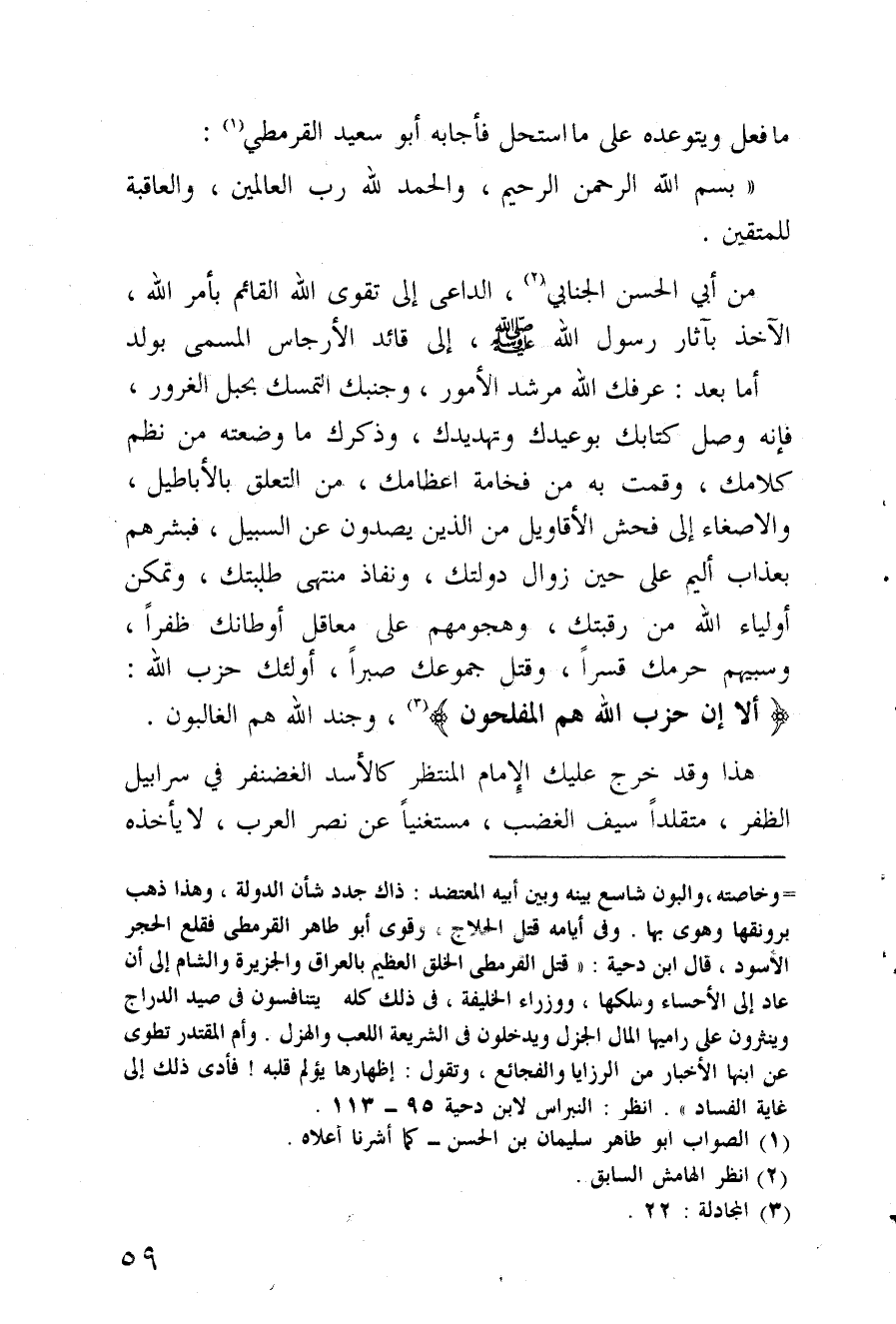 "بسم الله الرحمن الرحيم والحمد الله رب العالمين والعاقبة للمتقين، من أبي الحسن الجنابي الداعي إلى تقوى الله القائم بأمر الله والآخذ بآثار رسول الله - صلى الله عليه وسلم - إلى قائد الأرجاس المسمى بولد العباس. أما بعد، عرفك الله مراشد الأمور وجنبك التمسك بحبل الغرور، فإنه وصل كتابك بوعيد وتهديدك وذكرك ما وضعته من نظم كلامك ونمت به من فخامة أعظامك من التعلق بالأباطيل والإصغاء إلى فحش الأقاويل من الذين يصدون عن السبيل فبشرهم بعذاب أليم على حين زوال دولتك ونفاذ منتهى طلبتك وتمكن أولياء الله من رقبتك وهجومهم على معاقل أوطانك صغرا وسبيهم حرمك قسرا وقتل مجموعتك صبرا أولئك حزب الله إلا أن حزب الله هم المفلحون وجند الله هم الغالبون، هذا قد خرج عليك الإمام المنتظر كالأسد الغضنفر في سرابيل الظفر متقلدا سيف الغضب مستغنيا عن نصر العرب لا يأخذه