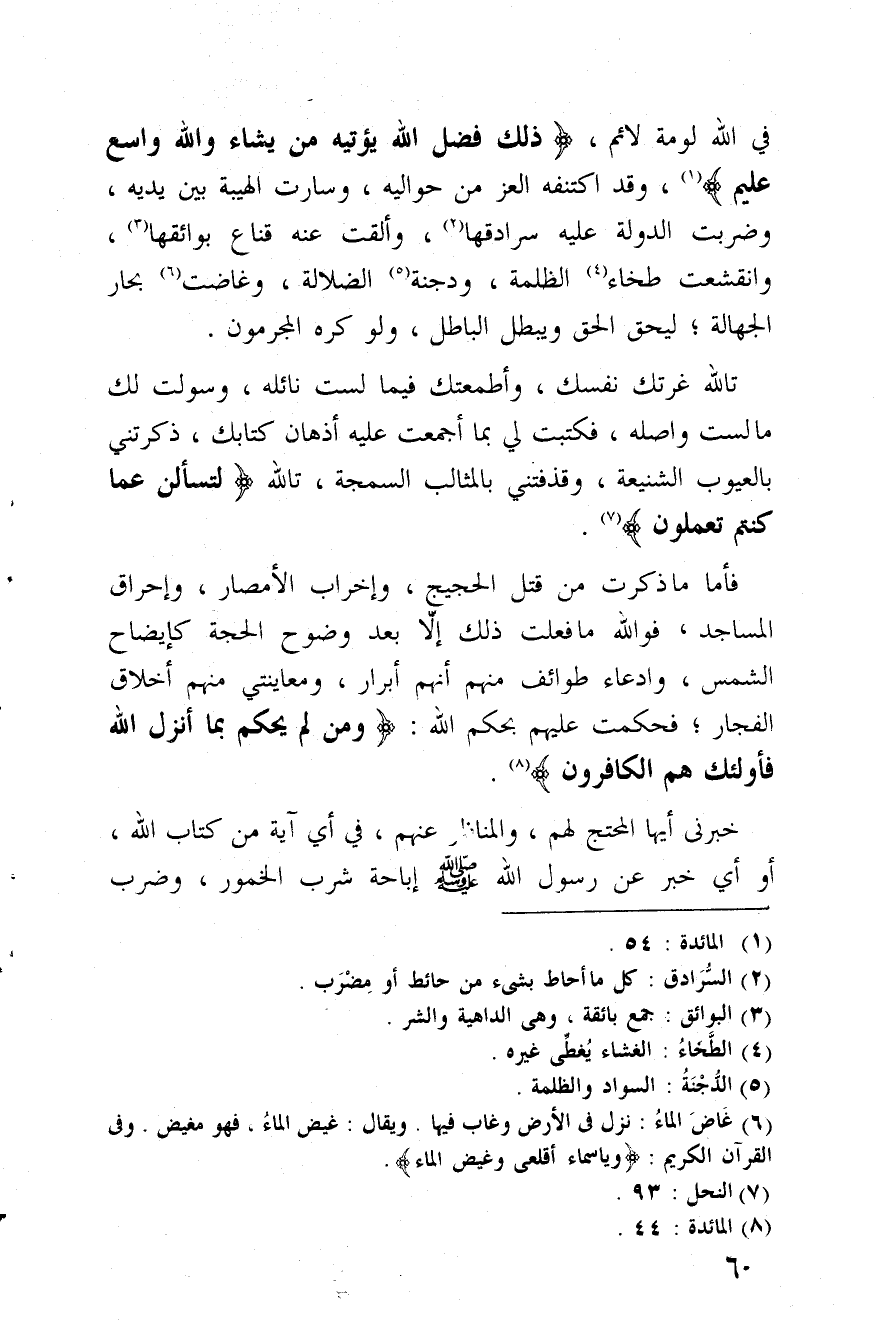 فأما ما ذكرت من قتل الحجيج، وإخراب الأمصار، وإحراق المساجد " فواللة ما فعلت ذلك إلّا بعد وضوح الحجة كإيضاح الشمس، وادعاء طوائف منهم أنهم أبرار، ومعاينتي منهم أخلاق الفجار، فحكمت عليهم بحكم الله: (ومن لم يحكم بما أنزل الله فأولئك هم الكافرون).