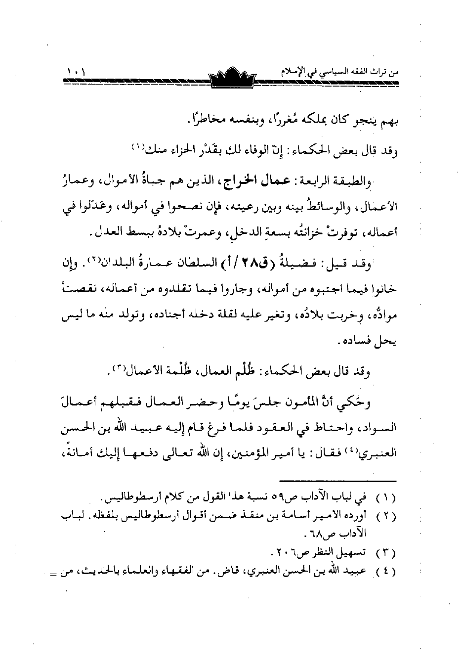 والطبقة الرَّابِعَة عُمَّال الْخراج الَّذين هم جباة الْأَمْوَال وعمار الْأَعْمَال والوسائط بَينه وَبَين رَعيته فَإِن نصحوا فِي أَمْوَاله وَعدلُوا فِي أَعماله توفرت خزانته بسعة الدخل وعمرت بِلَاده ببسط الْعدْل