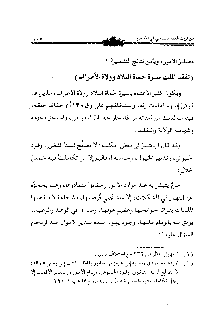وَيكون كثير الاعتناء بسيرة حماة الْبِلَاد وولاة الْأَطْرَاف الَّذين قد فوض إِلَيْهِم أمانات ربه واستخلفهم على حفاظ خلقه فَينْدب لذَلِك من أمنائه من قد حَاز خِصَال التَّفْوِيض وَاسْتحق بحزمه وشهامته الْولَايَة والتقليد