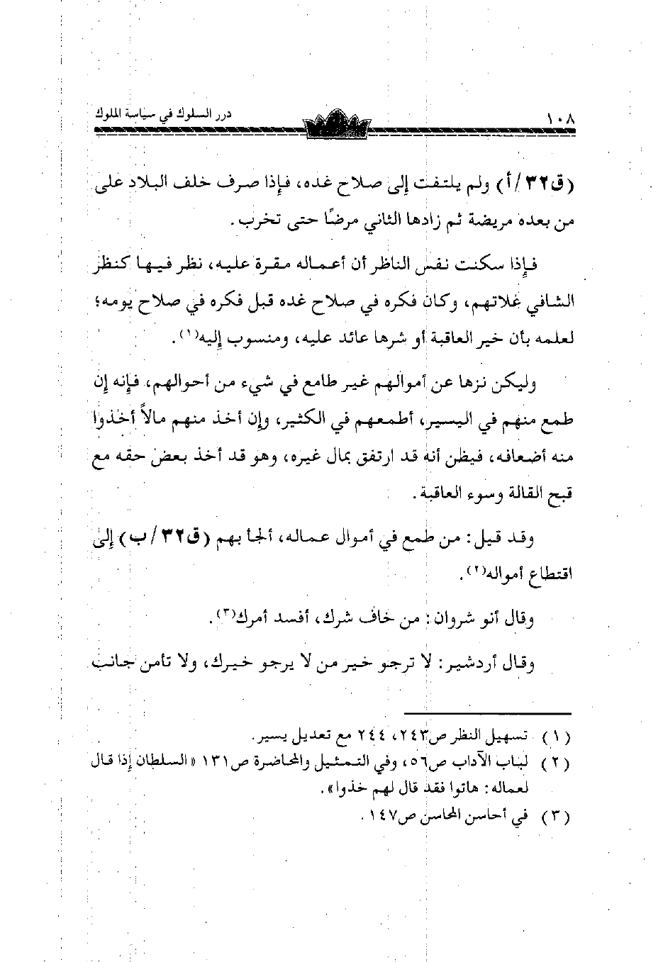 وَليكن نزها عَن أَمْوَالهم غير طامع فِي شَيْء من أَحْوَالهم فَإِنَّهُ إِن طمع مِنْهُم فِي الْيَسِير أطمعهم فِي الْكثير وَإِن أَخذ مِنْهُم مَالا أخذُوا مِنْهُ أضعافه فيظن أَنه قد ارتفق بِمَال غَيره وَهُوَ قد أَخذ بعض حَقه مَعَ قبح القالة وَسُوء العاقية