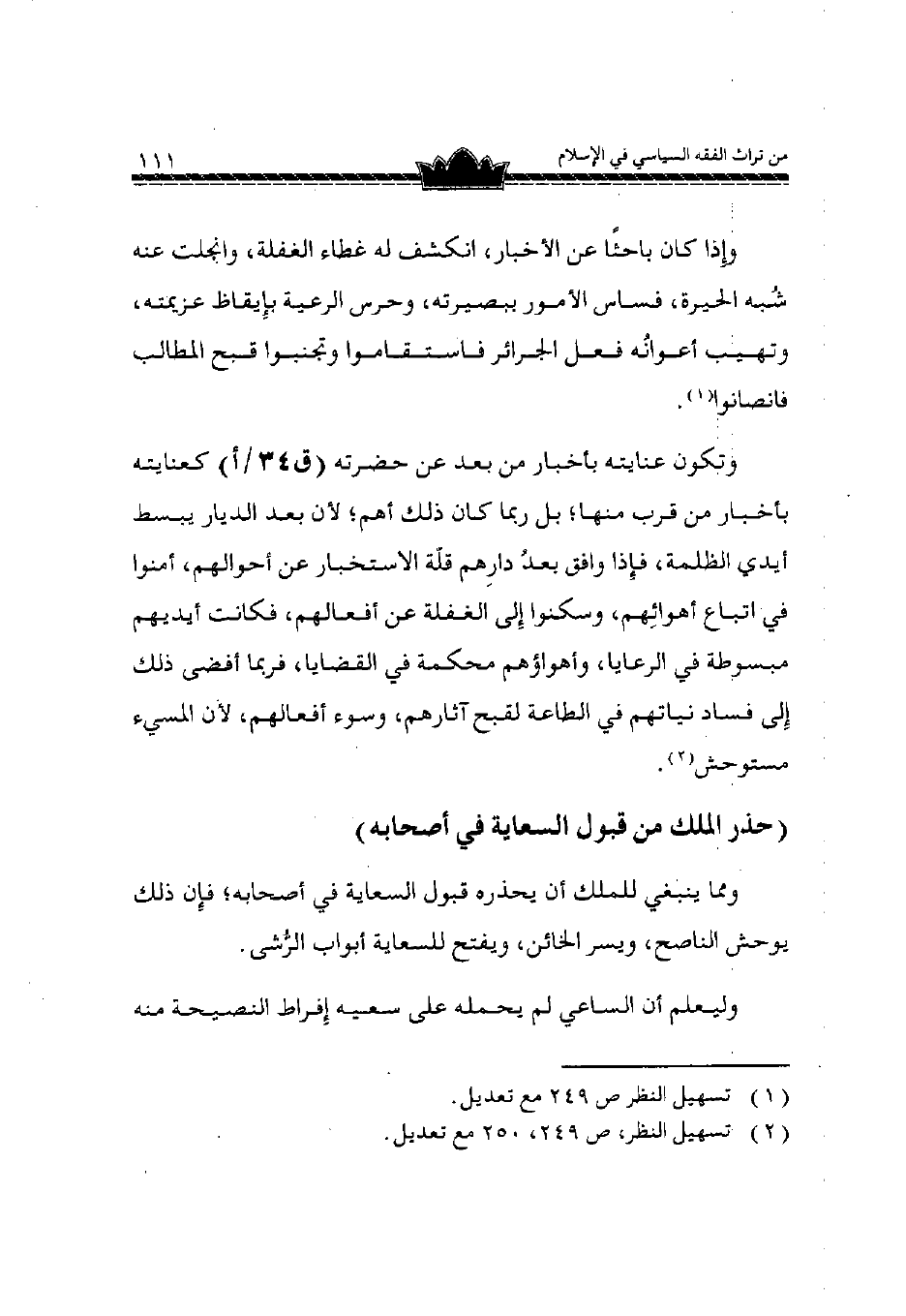 وَإِذا كَانَ باحثا عَن الْأَخْبَار انْكَشَفَ لَهُ غطاء الْغَفْلَة وانجلت عَنهُ شبه الْحيرَة فساس الْأُمُور ببصيرته وحرس الرّعية بإيقاظ عزيمته وتهيب أعوانه فعل الجرائر فاستقاموا وتجنبوا قبح المطالب فانصانوا