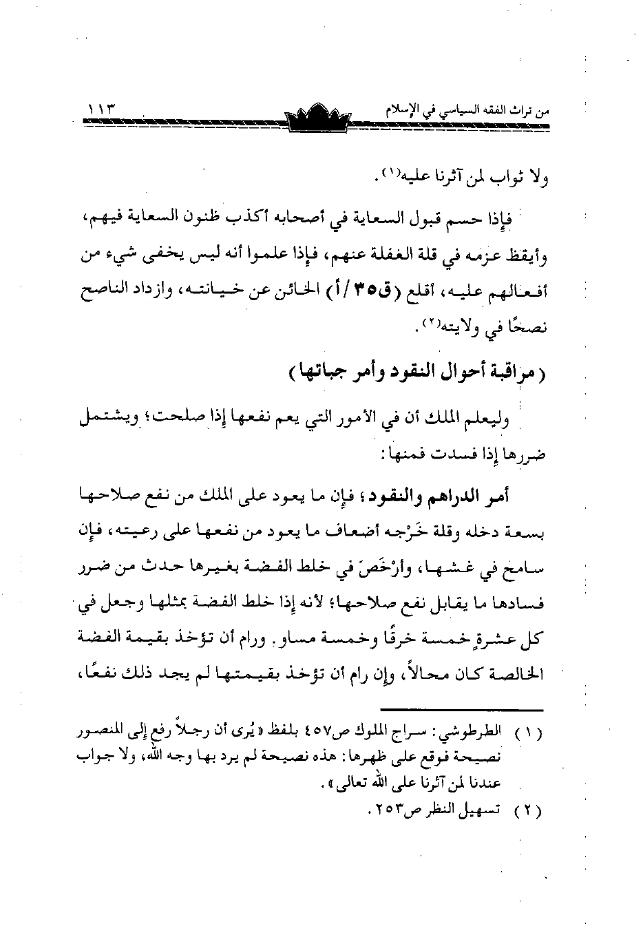 أَمر الدَّرَاهِم والنقود فَإِن مَا يعود على الْملك من نفع صَلَاحهَا بسعة دخله وَقلة خرجه أَضْعَاف مَا يعود من نَفعهَا على رَعيته فَإِن سامح فِي غشها وأرخص فِي خلط الْفضة بغَيْرهَا حدث من ضَرَر فَسَادهَا مَا يُقَابل نفع صَلَاحهَا لِأَنَّهُ إِذا خلط الْفضة بِمِثْلِهَا وَجعل فِي كل عشرَة خَمْسَة خرقا وَخَمْسَة مسَاوٍ ورام أَن تُؤْخَذ بِقِيمَة الْفضة الْخَالِصَة كَانَ محالا وَإِن رام أَن تُؤْخَذ بِقِيمَتِهَا لم يجد ذَلِك نفعا