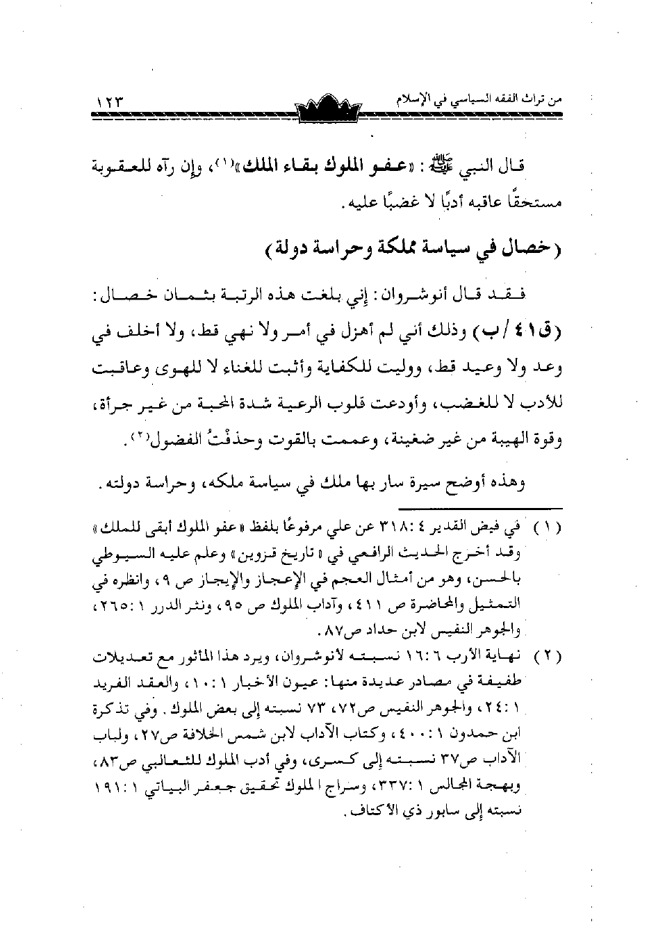 فقد قَالَ أنو شرْوَان إِنِّي بلغت هَذِه الرُّتْبَة بثمان خِصَال وَذَلِكَ أَنِّي لم أهزل فِي أَمر وَلَا نهي قطّ وَلَا أخلف فِي وعد وَلَا وَعِيد قطّ وَوليت للكفاية وَأثبت للغناء لَا للهوى وعاقبت للأدب لَا للغضب وأودعت قُلُوب الرّعية شدَّة الْمحبَّة من غير جرْأَة وَقُوَّة الهيبة من غير ضغينة وعممت بالقوت وحذفت الفضول