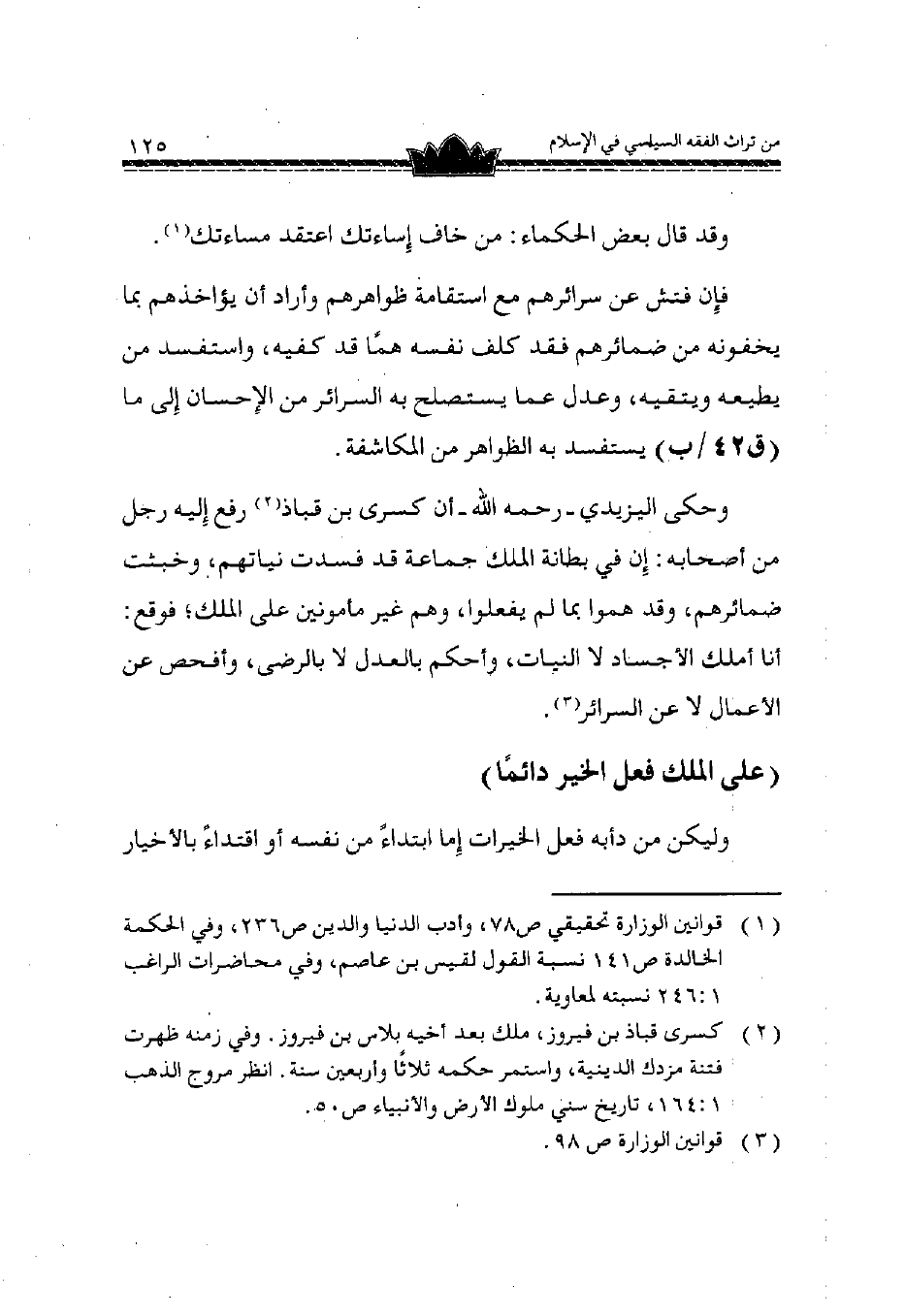وَحكى اليزيدي رَحمَه الله أَن كسْرَى بن قباذ رفع إِلَيْهِ رجل من أَصْحَابه إِن فِي بطانة الْملك جمَاعَة قد فَسدتْ نياتهم وخبثت ضمائرهم وَقد هموا بِمَا لم يَفْعَلُوا وهم غير مأمونين على الْملك فَوَقع أَنا أملك الأجساد لَا النيات وَأحكم بِالْعَدْلِ لَا بالرضى وأفحص عَن الْأَعْمَال لَا عَن السرائر
