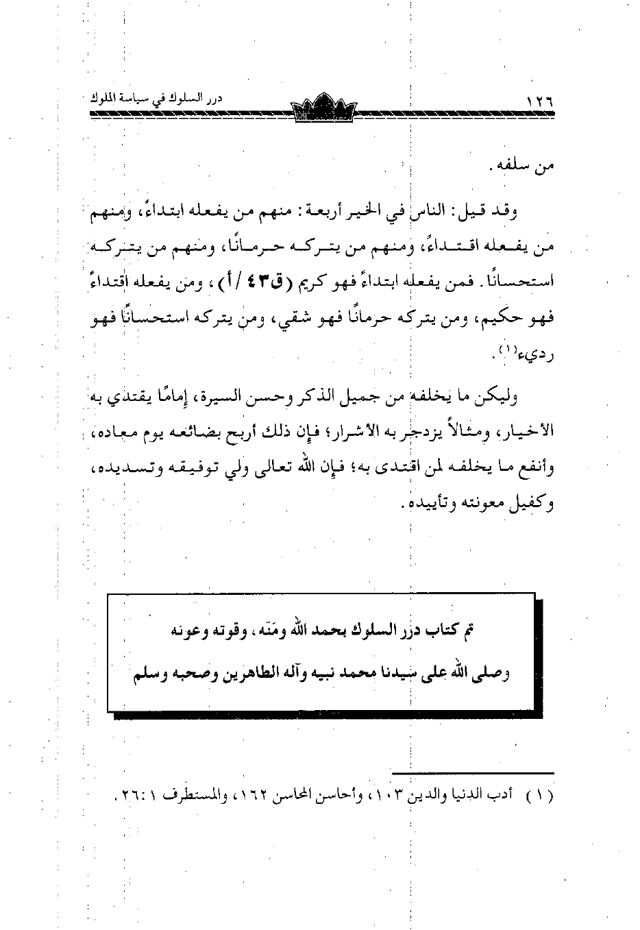 تمّ كتاب دُرَر السلوك بِحَمْد الله وَمِنْه وقوته وعونه وَصلى الله على سيدنَا مُحَمَّد نبيه وَآله الطاهرين وَصَحبه وَسلم