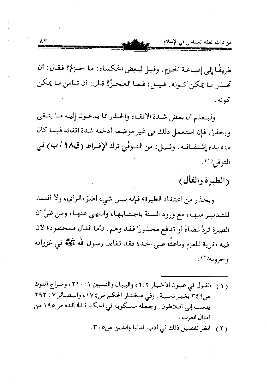 ويحذر من اعْتِقَاد الطَّيرَة فَإِنَّهُ لَيْسَ شَيْء أضرّ بِالرَّأْيِ وَلَا أفسد للتدبير مِنْهَا مَعَ وُرُود السّنة باجتنابها وَالنَّهْي عَنْهَا وَمن ظن أَن الطَّيرَة ترد قَضَاء أَو تدفع محذورا فقد وهم فَأَما الفأل فمحمود لِأَن فِيهِ تَقْوِيَة للعزم وباعثا على الْجد فقد تفاءل رَسُول الله صلى الله عَلَيْهِ وَسلم فِي غَزَوَاته وحروبه