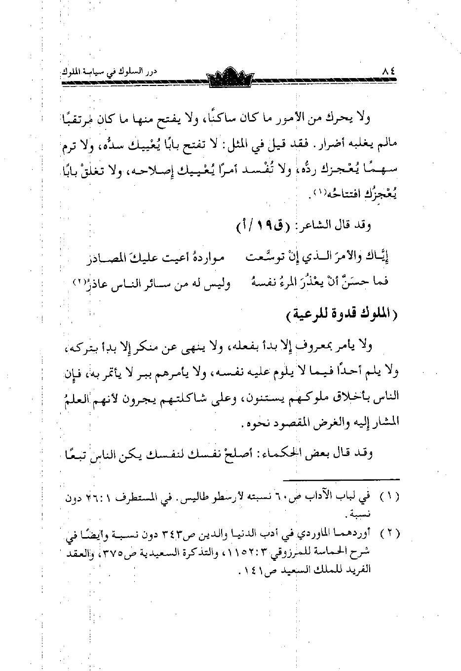 وَلَا يُحَرك من الْأُمُور مَا كَانَ سَاكِنا وَلَا يفتح مِنْهَا مَا كَانَ مرتقبا مَا لم يغلبه أضرار فقد قيل فِي الْمثل لَا تفتح بَابا يعييك سَده وَلَا ترم سَهْما يعجزك رده وَلَا تفْسد أمرا يعييك إِصْلَاحه وَلَا تغلق بَابا يعجزك افتتاحه