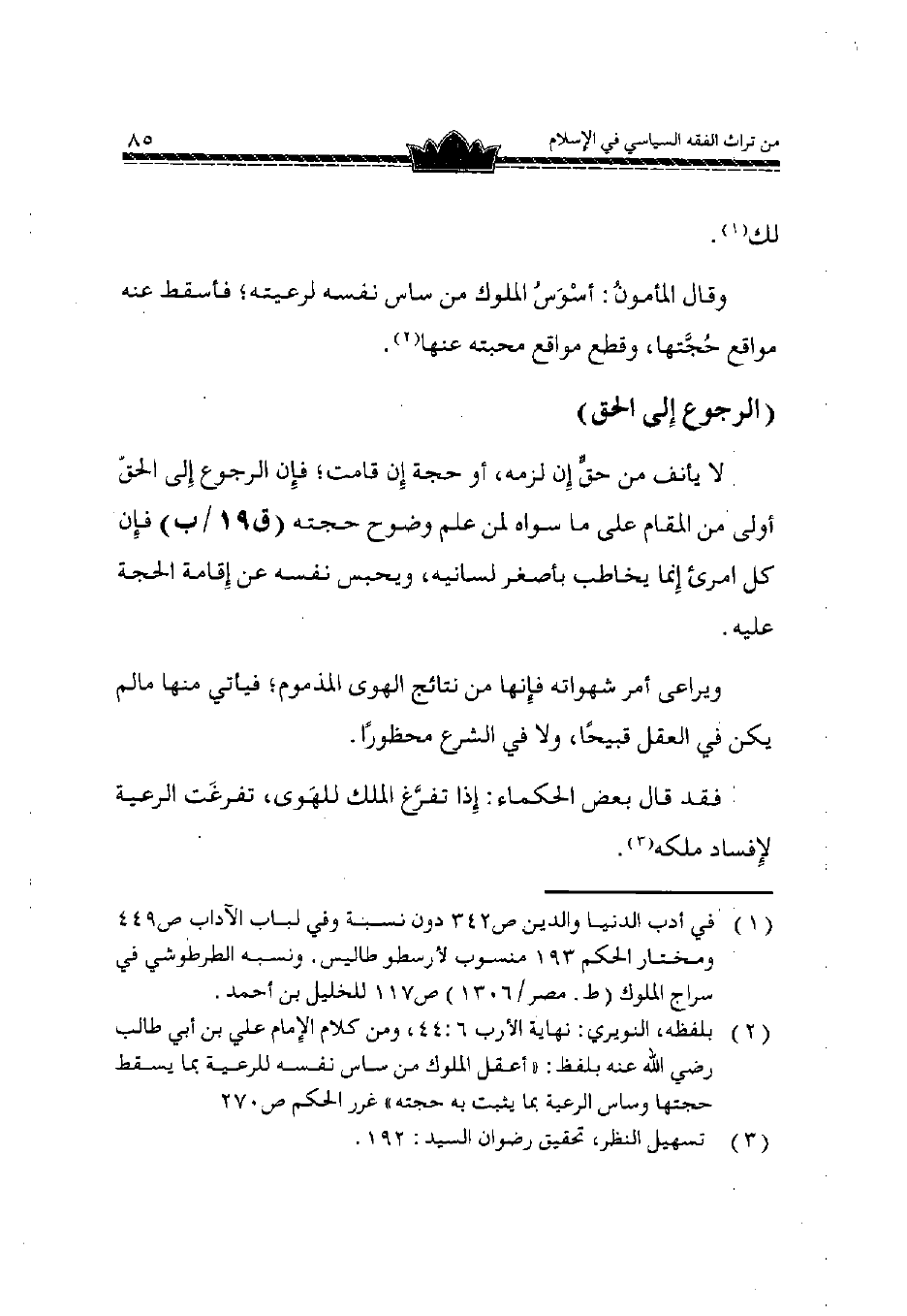 لَا يأنف من حق إِن لزمَه أَو حجَّة إِن قَامَت فَإِن الرُّجُوع إِلَى الْحق أولى من الْمقَام على مَا سواهُ لمن علم وضوح حجَّته فَإِن كل امْرِئ إِنَّمَا يُخَاطب بأصغر لسانيه وَيحبس نَفسه عَن إِقَامَة الْحجَّة عَلَيْهِ