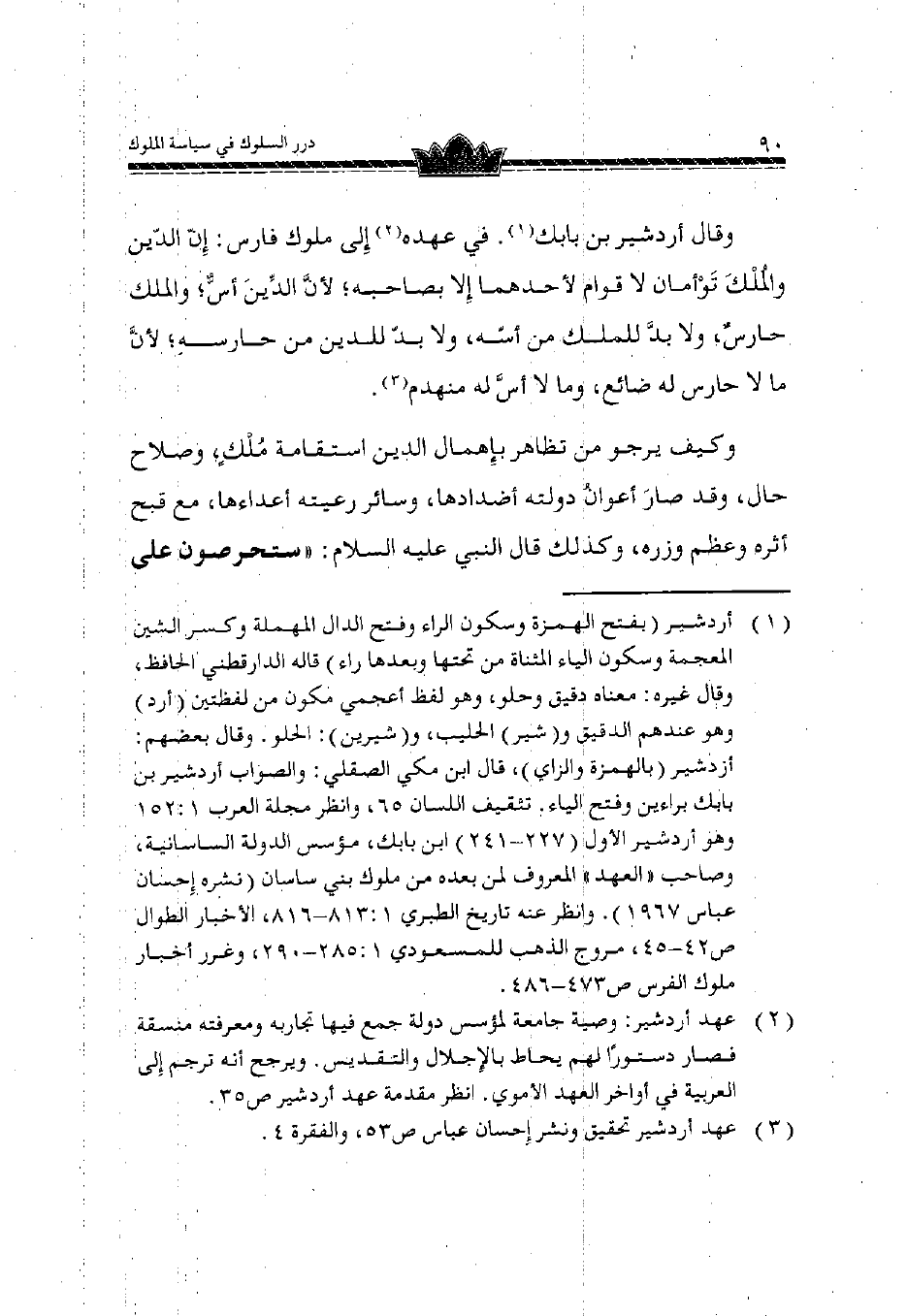 وَقَالَ أردشير بن بابك فِي عَهده إِلَى مُلُوك فَارس إِن الدّين وَالْملك توأمان لَا قوام لأَحَدهمَا إِلَّا بِصَاحِبِهِ لِأَن الدّين أس وَالْملك حارس وَلَا بُد للْملك من أسه وَلَا بُد للدّين من حارسه لِأَن مَا لَا حارس لَهُ ضائع وَمَا لَا أس لَهُ منهدم