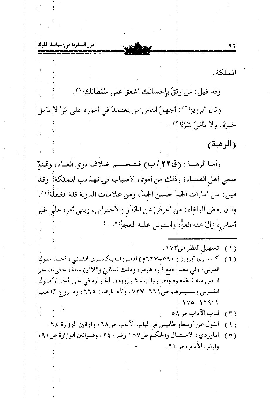 وَقَالَ أبرويز أَجْهَل النَّاس من يعْتَمد فِي أُمُوره على من لَا يأمل خَيره وَلَا يَأْمَن شَره