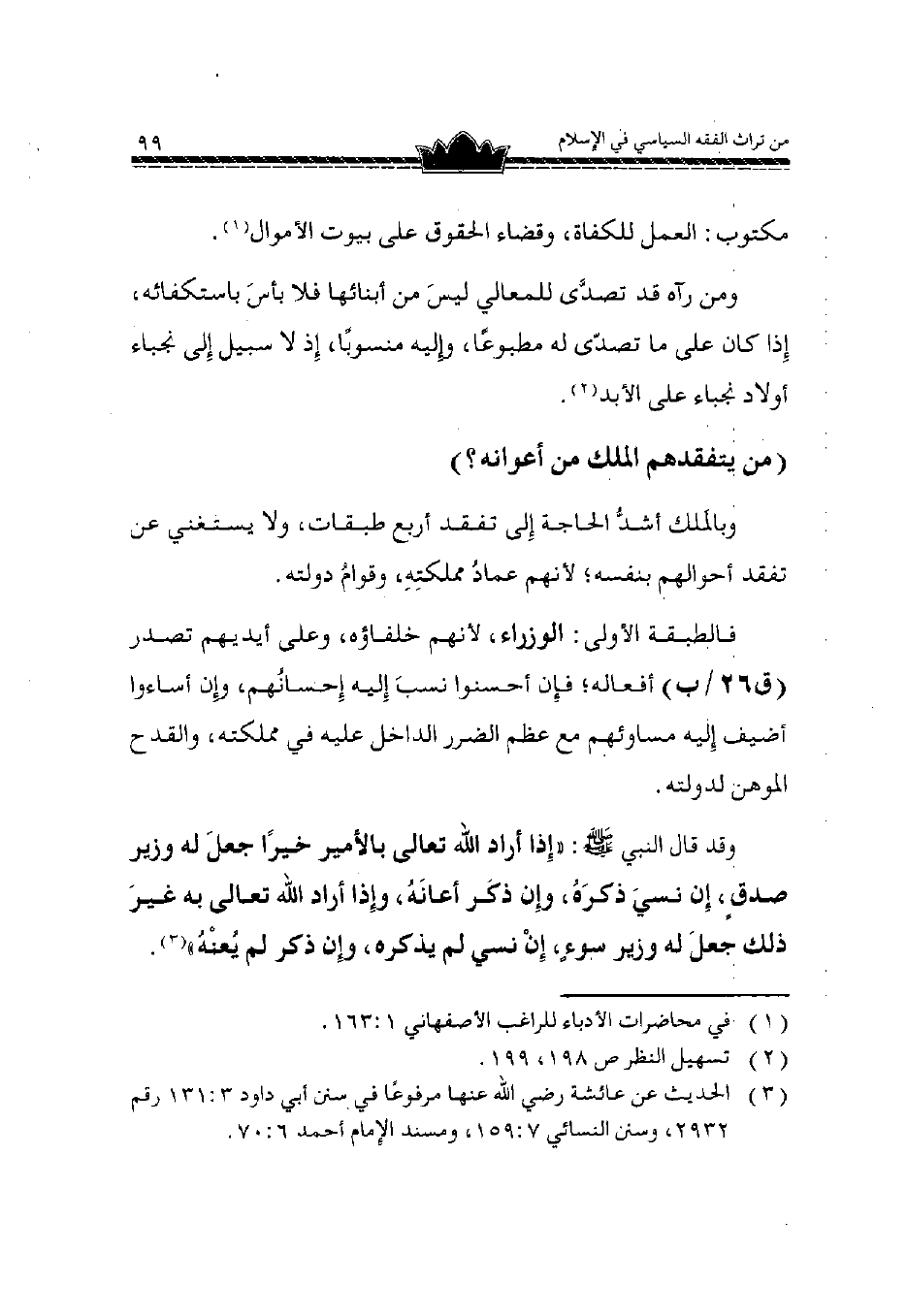 فالطبقة الأولى الوزراء لأَنهم خلفاؤه وعَلى أَيْديهم تصدر أَفعاله فَإِن أَحْسنُوا نسب إِلَيْهِ إحسانهم وَإِن أساءوا أضيف إِلَيْهِ مساوئهم مَعَ عظم الضَّرَر الدَّاخِل عَلَيْهِ فِي مَمْلَكَته والقدح الموهن لدولته