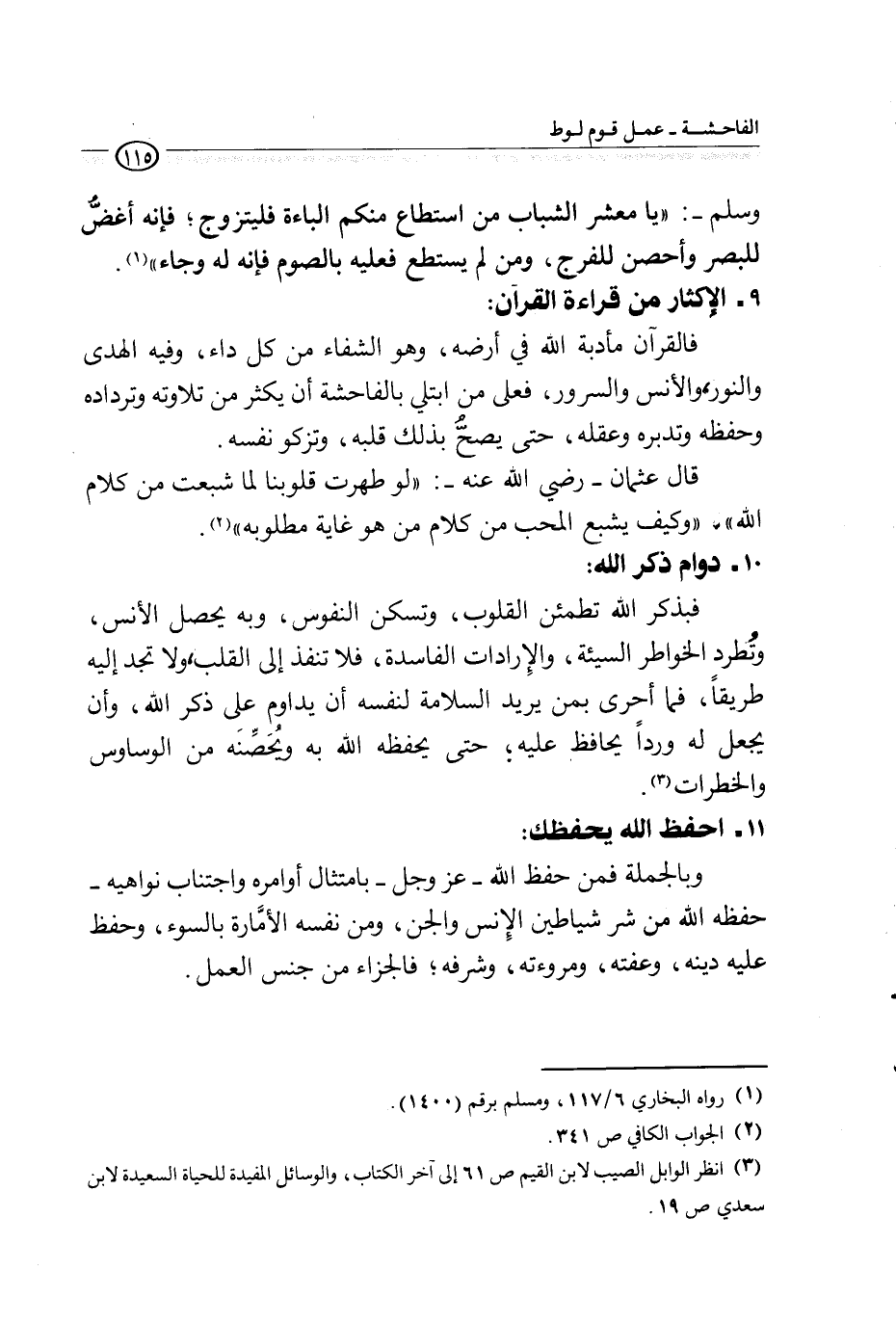 فالقرآن مأدبة الله في أرضه، وهو الشفاء من كل داء، وفيه الهدى والنور، والأنس والسرور، فعلى من ابتلي بالفاحشة أن يكثر من تلاوته وترداده وحفظه وتدبره وعقله، حتى يصح بذلك قلبه، وتزكو نفسه.