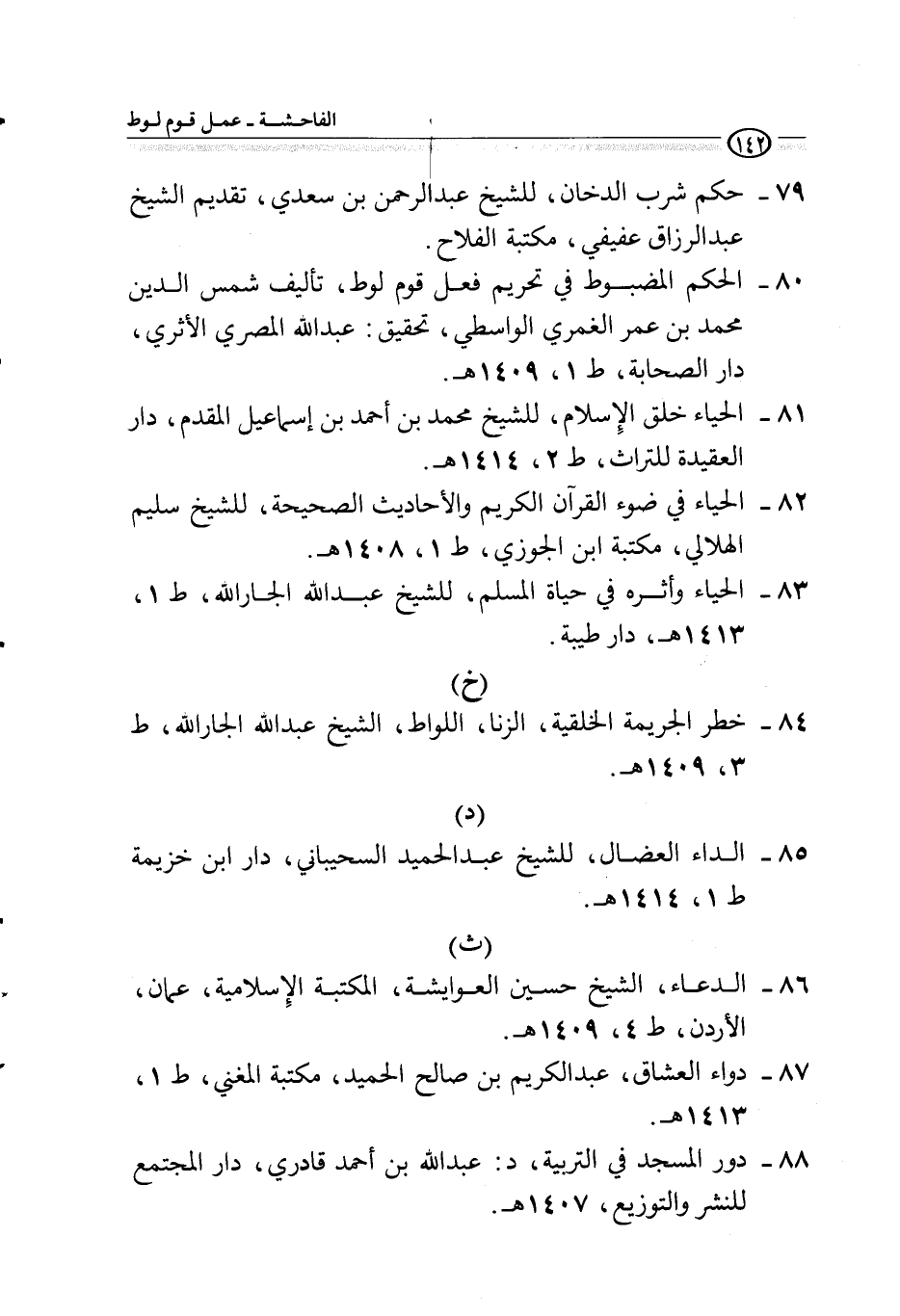 80 ـ الحكم المضبوط في تحريم فعل قوم لوط، تأليف شمس الدين محمد بن عمر الغمري الواسطي، تحقيق: عبد الله المصري الأثري، دار الصحابة، ط 1، 1409 هـ.