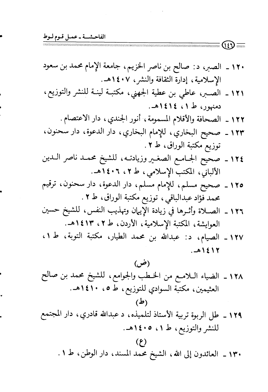 121 ـ الصبر، عاطي بن عطية الجهني، مكتبة لينة للنشر والتوزيع، دمنهور، ط 1، 1414 هـ.