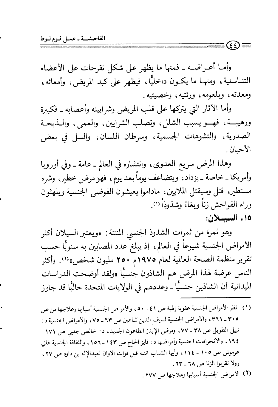 1 انظر الأمراض الجنسية عقوبة إلهية ص 41 ـ 50، والأمراض الجنسية أسبابها وعلاجها من ص 305 ـ 361، والأمراض الجنسية لسيف الدين شاهين ص 63 ـ 75، والأمراض الجنسية د: نبيل الطويل ص 38 ـ 77، ومرض الإيدز الطاعون الجديد، د: خالص جلبي ص 171 ـ 194، والانحرافات الجنسية وأمراضها د: فايز الحاج ص 143 ـ 156، والثقافة الجنسية لهاني عرموش ص 105 ـ 114، وأيها الشباب انتبه قبل فوات الأوان لعبد الإله بن داود ص 27، وولا تقربوا الزنا ص 68 ـ 63.