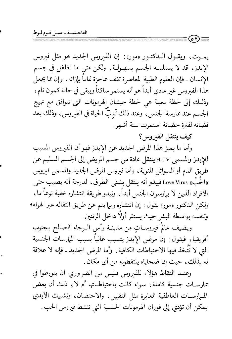 يموت، ويقول الدكتور ((مور)) : إن الفيروس الجديد هو مثل فيروس الإيدز، قد لا يستلمه الجسم بسهولة، ولكن متى ما يتغلغل في جسم الإنسان ـ فإن العلوم الطبية المعاصرة تقف عاجزة تماما بإزائه، وإن مما يجعل هذا الفيروس غير عادي أبدا هو أنه يستمر ساكنا ويبقى في حالة كمون تام، وذلك إلى لحظة معينة هي لحظة جيشان الهرمونات التي تتوافق مع تهيج الجسم عند ممارسة الجنس، وعند ذلك تدب الحياة في الفيروس، وذلك بعد قضائه لفترة حضانة استمرت ستة أشهر.