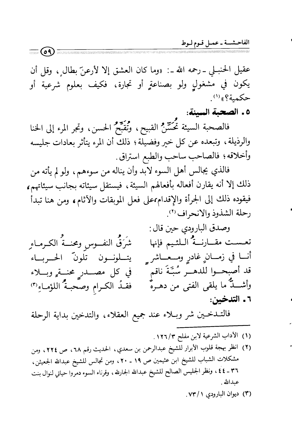 2 انظر بهجة قلوب الأبرار للشيخ عبد الرحمن بن سعدي، الحديث رقم 68، ص 224، ومن مشكلات الشباب للشيخ ابن عثيمين ص 19 ـ 20، ومن تجالس للشيخ عبد الله الجعيثن، 36 ـ 44، وانظر الجليس الصالح للشيخ عبد الله الجار الله، وقرناء السوء دمروا حياتي لنوال بنت عبد الله.