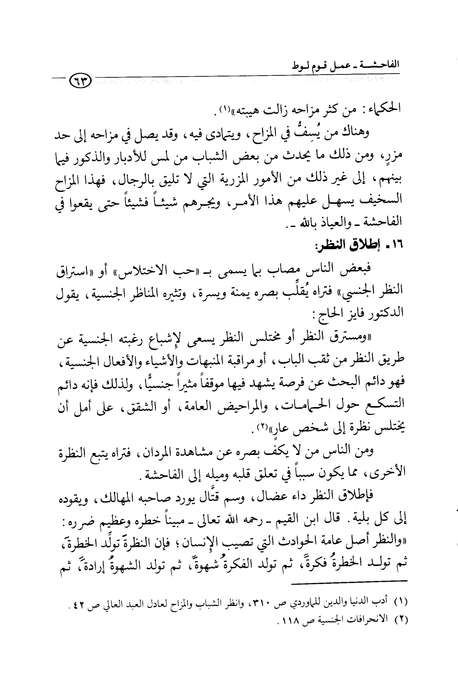 ومن الناس من لا يكف بصره عن مشاهدة المردان، فتراه يتبع النظرة الأخرى، مما يكون سببا في تعلق قلبه وميله إلى الفاحشة.