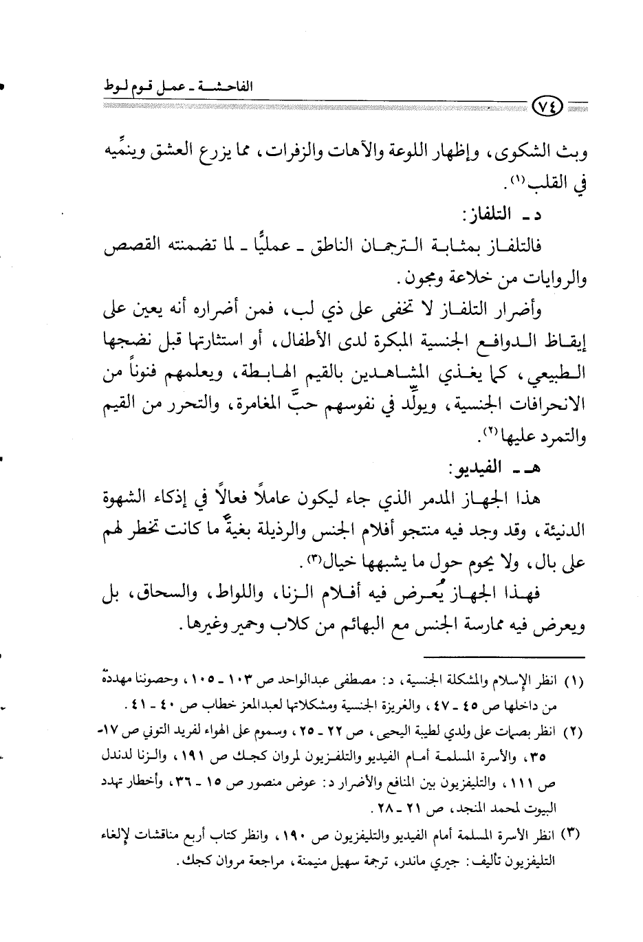2 انظر بصمات على ولدي لطيبة اليحيى، ص 22 ـ 25، وسموم على الهواء لفريد التوني ص 17 ـ 35، والأسرة المسلمة أمام الفيديو والتلفزيون لمروان كجك ص 191، والزنا لدندل ص 111، والتلفزيون بين المنافع والأضرار د: عوض منصور ص 15 ـ 36، وأخطار تهدد البيوت لمحمد المنجد، ص 21ـ28.