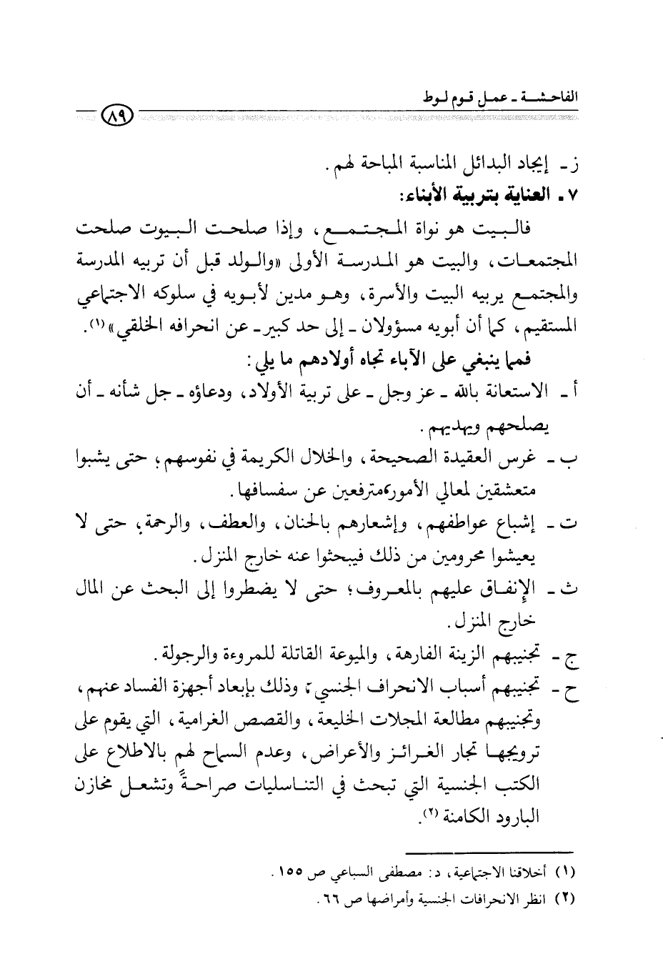 ح ـ تجنيبهم أسباب الانحراف الجنسي، وذلك بإبعاد أجهزة الفساد عنهم، وتجنبيبهم مطالعة المجلات الخليعة، والقصص الغرامية، التي يقوم على ترويجها تجار الغرائز والأعراض، وعدم السماح لهم بالاطلاع على الكتب الجنسية التي تبحث في التناسليات صراحة وتشعل مخازن البارود الكامنة 2.