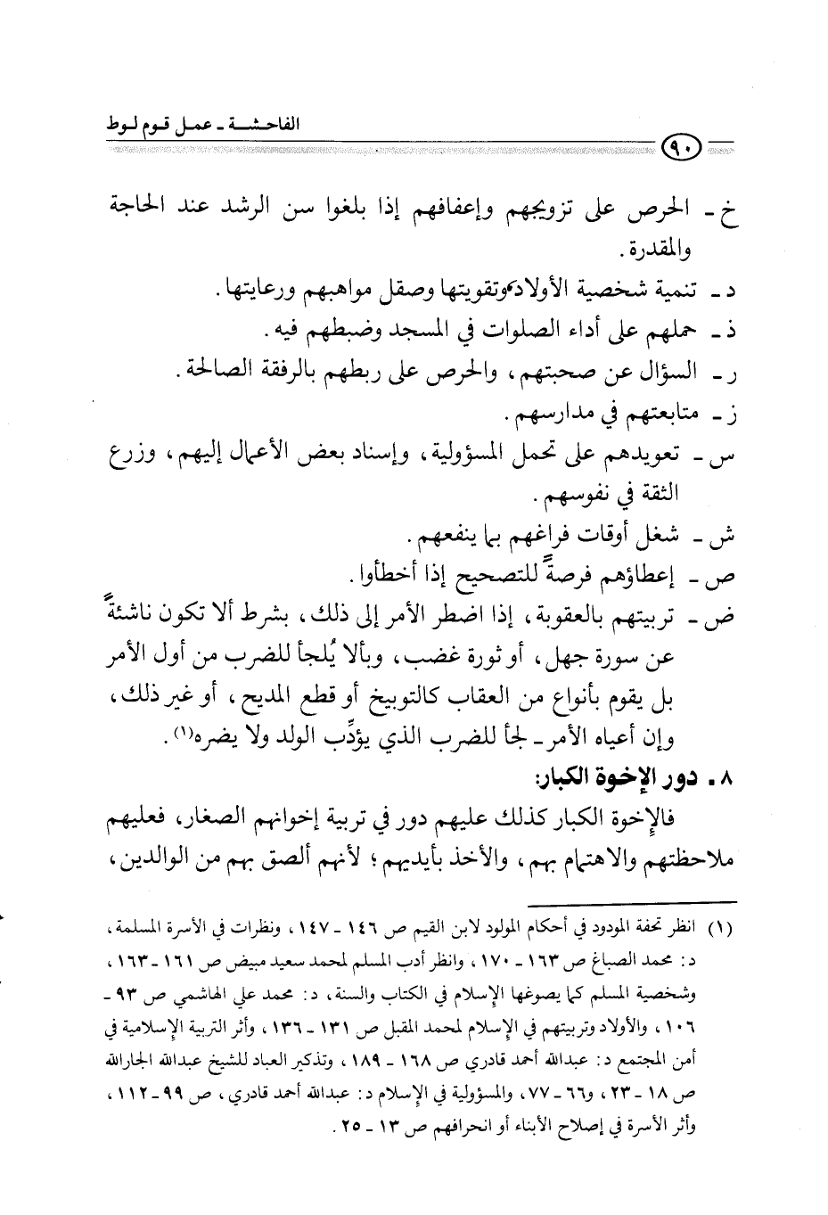 1 انظر تحفة المودود في أحكام المولود لابن القيم ص 146 ـ 147، ونظرات في الأسرة المسلمة، د: محمد الصباغ ص 163 ـ 170، وانظر أدب المسلم لمحمد سعيد مبيض ص 161 ـ 163، وشخصية المسلم كما يصوغها الإسلام في الكتاب والسنة، د: محمد علي الهاشمي ص 93 ـ 106، والأولاد وتربيتهم في الإسلام لمحمد المقبل ص 131 ـ 136، وأثر التربية الإسلامية في أمن المجتمع د: عبد الله أحمد قادري ص 168 ـ 189، وتذكير العباد للشيخ عبد الله الجار الله ص 18 ـ 23، و 66 ـ 77، والمسؤولية في الإٍسلام د: عبد الله أحمد القادري، ص 99 ـ 112، وأثر الأٍسرة في إصلاح الأبناء أو انحرافهم ص 13 ـ 25.