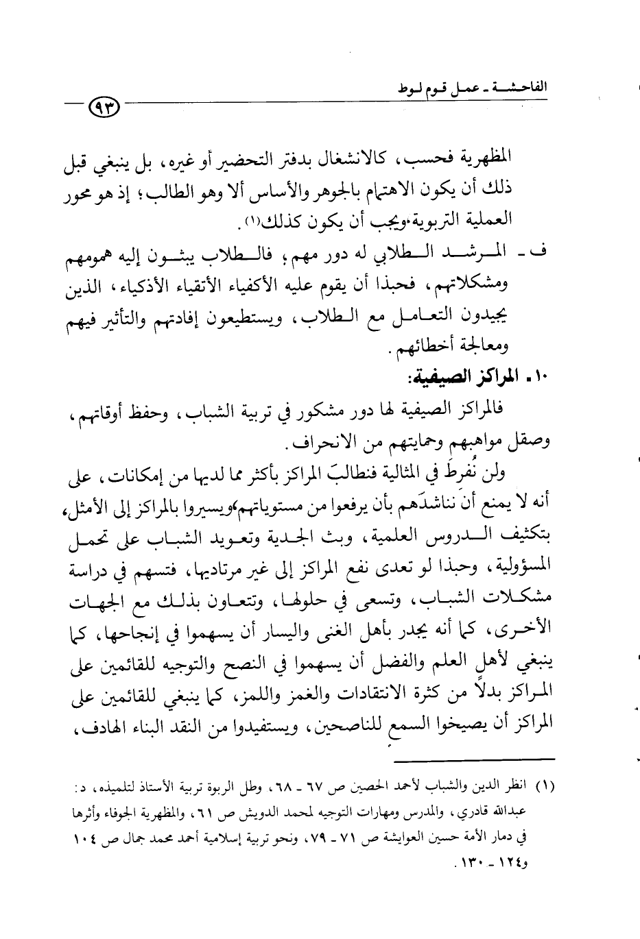 ولن نفرط في المثالية فنطالب المراكز بأكثر مما لديها من إمكانات، على أنه لا يمنع أن نناشدهم بأن يرفعوا من مستوياتهم، ويسيروا بالمراكز إلى الأمثل، بتكثيف الدروس العلمية، وبث الجدية وتعويد الشباب على تحمل المسؤولية، وحبذا لو تعدى نفع المراكز إلى غير مرتاديها، فتسهم في دراسة مشكلات الشباب، وتسعى في حلولها، وتتعاون بذلك مع الجهات الأخرى، كما أنه يجدر بأهل الغنى واليسار أن يسهموا في إنجاحها، كما ينبغي لأهل العلم والفضل أن يسهموا في النصح والتوجيه للقائمين على المراكز بدلا من كثرة الانتقادات والغمز واللمز، كما ينبغي للقائمين على المراكز أن يصيخوا السمح للناصحين، ويستفيدوا من النقد البناء الهادف، 1 انظر الدين والشباب لأحمد الحصين ص 67 ـ 68، وطل الربوة تربية الأستاذ لتلميذه، د: عبد الله قادري، والمدرس ومهارات التوجيه لمحمد الدويش ص 61، والمظهرية الجوفاء وأثرها في دمار الأمة حسين العوايشة ص 71 ـ 79، ونحو تربية إسلامية أحمد محمد جمال ص 104 و 124 ـ 130.