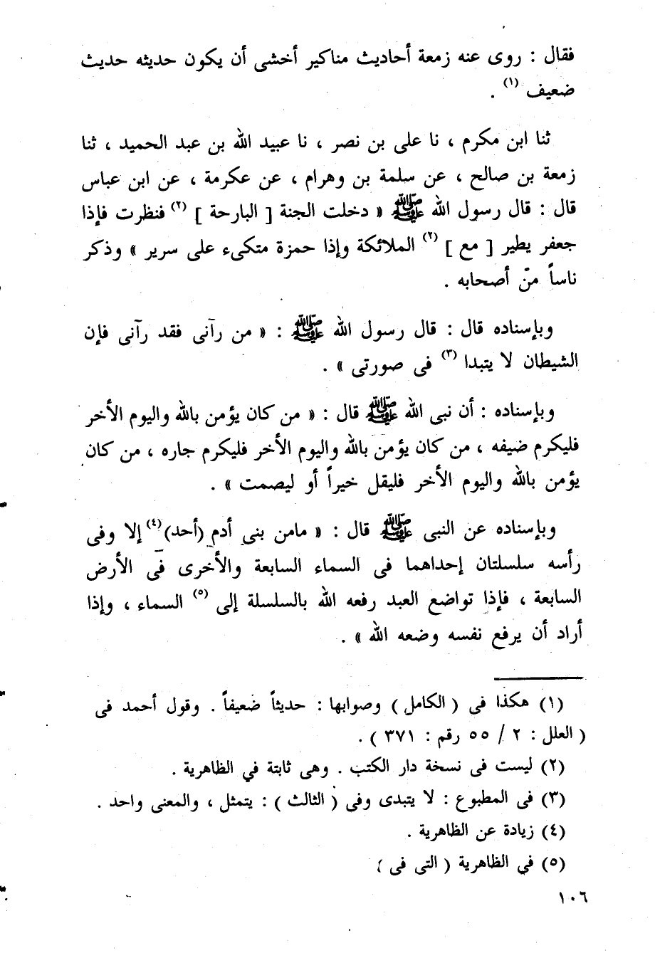 فَقَالَ روى عَنهُ زَمعَة أَحَادِيث مَنَاكِير أخْشَى أَن يكون حَدِيثه حَدِيث ضَعِيف