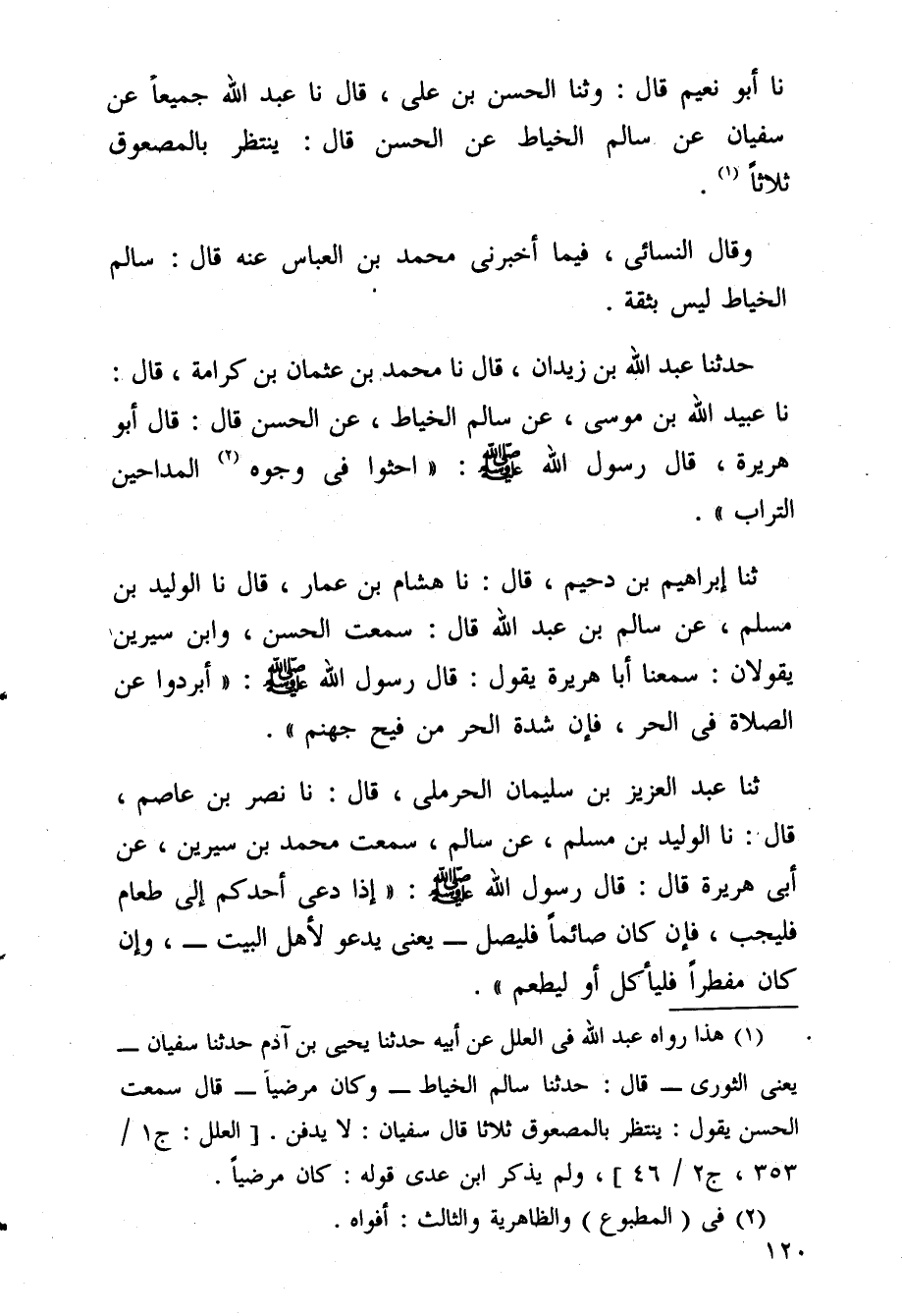 ثَنَا إِبْرَاهِيم بن دُحَيْم قَالَ نَا هِشَام بن عمار قَالَ نَا الْوَلِيد بن مُسلم عَن سَالم بن عبد الله قَالَ سَمِعت الْحسن وَابْن سِيرِين يَقُولَانِ سمعنَا أَبَا هُرَيْرَة يَقُول قَالَ رَسُول الله صلى الله عَلَيْهِ وَسلم أبردوا عَن الصَّلَاة فى الْحر فَإِن شدَّة الْحر من فيح جَهَنَّم