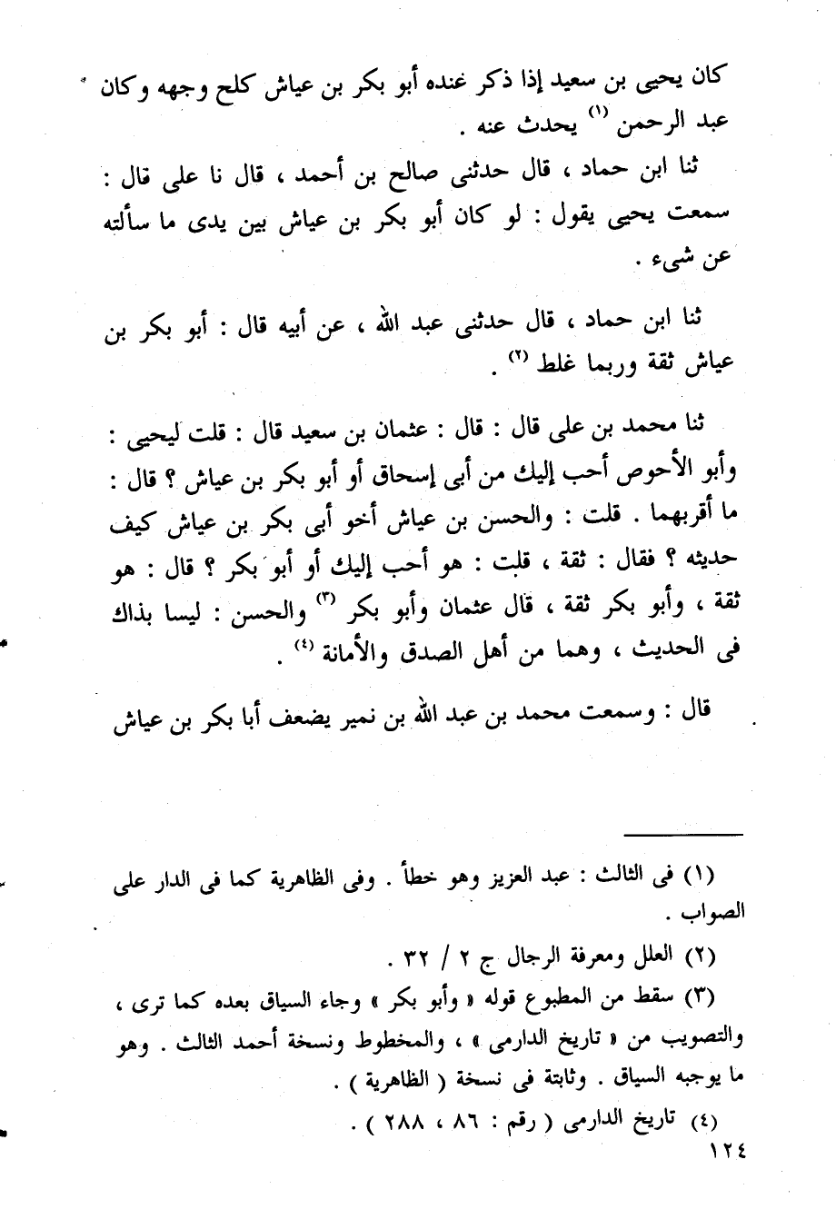 ثَنَا ابْن حَمَّاد قَالَ حَدَّثَنى عبد الله عَن أَبِيه قَالَ أَبُو بكر بن عَيَّاش ثِقَة وَرُبمَا غلط