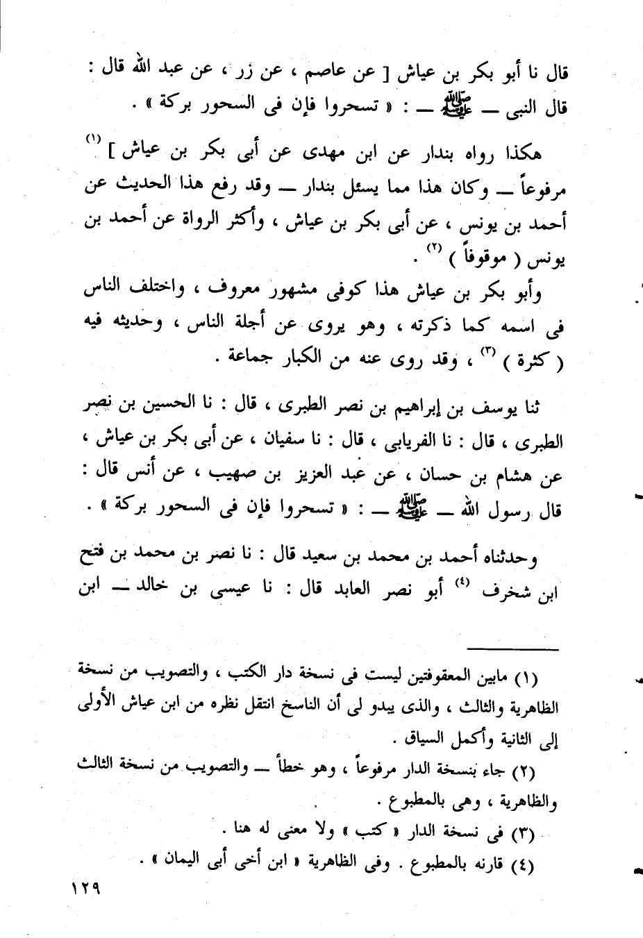 قَالَ نَا أَبُو بكر بن عَيَّاش عَن عَاصِم عَن زر عَن عبد الله قَالَ قَالَ النبى صلى الله عَلَيْهِ وَسلم تسحرُوا فَإِن فِي السّحُور بركَة