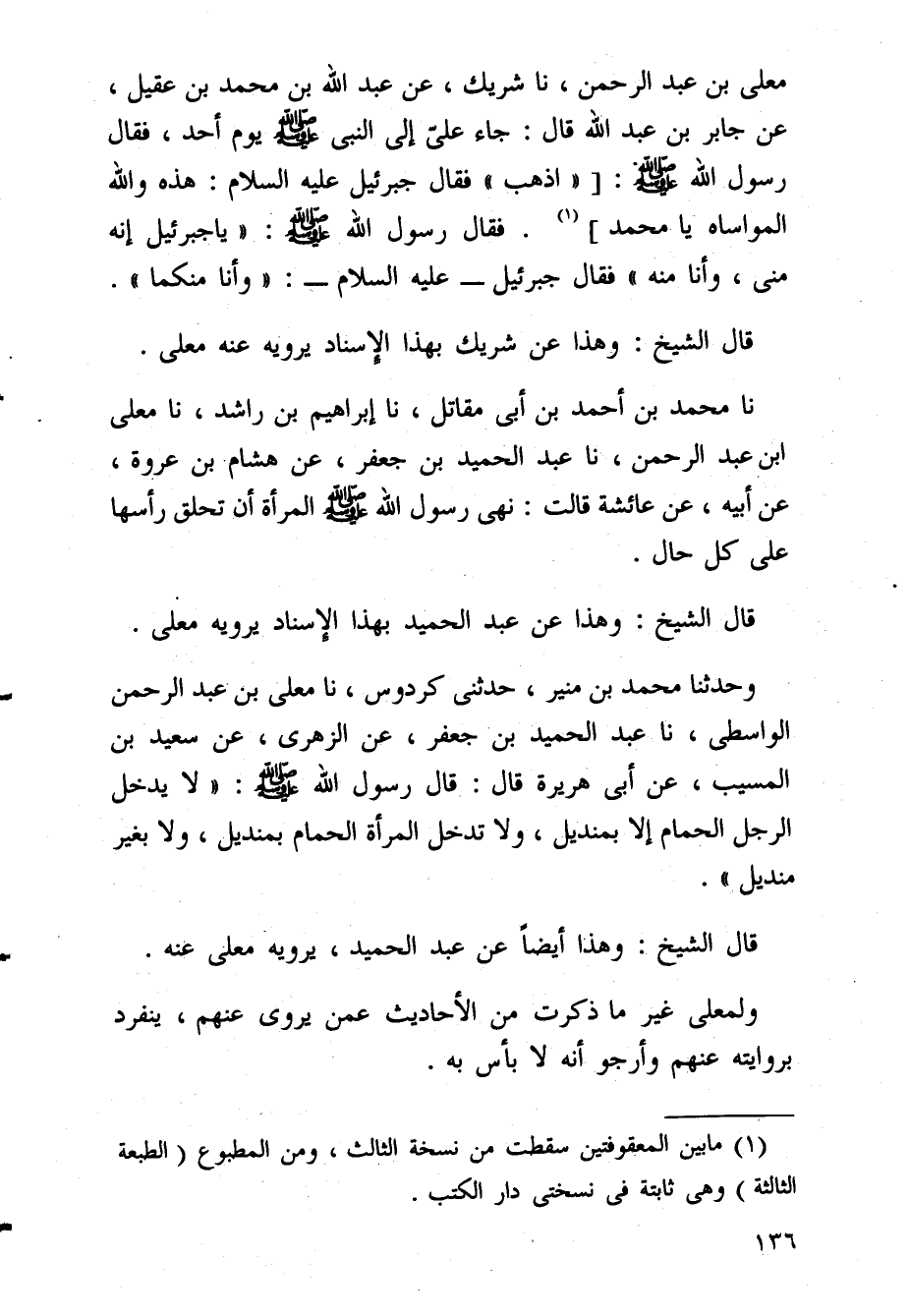 نَا مُحَمَّد بن أَحْمد بن أَبى مقَاتل نَا إِبْرَاهِيم بن رَاشد نَا مُعلى ابْن عبد الرَّحْمَن نَا عبد الحميد بن جَعْفَر عَن هِشَام بن عُرْوَة عَن أَبِيه عَن عَائِشَة قَالَ نهى رَسُول الله صلى الله عَلَيْهِ وَسلم الْمَرْأَة أَن تحلق رَأسهَا على كل حَال