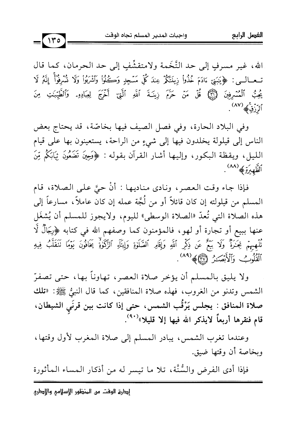 وينبغي أن يكون له حظ يومي من القراءة المنتظمة طلباً للزيادة في العلم، كما قال الله لرسوله: {وَقُلْ رَبِّ زِدْنِي عِلْمًا} (¬2) . ويحسن به أن يتخير من الكتب والمجلات ماينفعه في دينه ودنياه، وقد قال حكيم: أخبرني ماذا تقرأ أخبرك من أنت!