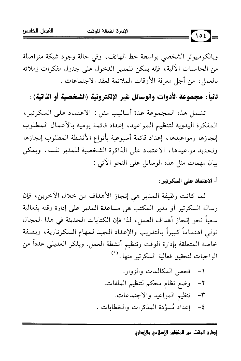صغيرًا للهاتف أو بطاقات تعريفية شخصية للمدير، وبشكل عام فإنها تساعد المدير على تذكر الأشياء المطلوب إنجازها بشكل يدوي مكتوب، وبخلاف ذلك تمامًا، فإن المدير قد يعتمد على ذاكرته الشخصية في تذكر الأشياء المطلوب إنجازها، دون الاستعانة بأي وسيلة يدوية أو إلكترونية لتنظيم المهمات المطلوب إنجازها وإدارتها، ومما لاشك فيه أن هذه الأخيرة تعتمد إلى حد كبير على قوة ذاكرة المدير وحالته الصحية العامة؛ ومن أشد عيوبها النسيان، وبخاصة في حالة تداخل المهمات ومواعيد إنجازها.