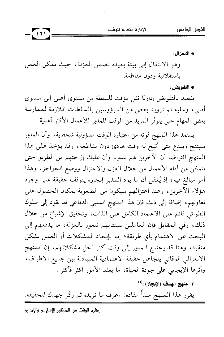 يقوم هذا المنهج على افتراض أن الأدوات المناسبة (مثل الجدول الزمني والمفكرة اليومية وبرنامج الحاسب ونحوها) ستعطي الفرد قدرة على الإدارة الفضلى؛ إذ يقرر هذا المنهج أن هذه الأدوات تضمن معرفة الأولويات، وتنظيم المهمات، والوصول إلى المعلومات بسهولة. والفرض الأساسي في هذا المنهج هو أن النظم والهياكل هي التي تساعد على جعل الأداة أكثر فاعلية، وأن ثمة ميزة كبيرة في الاستخدام الفعال لتلك الأدوات في تحقيق:
