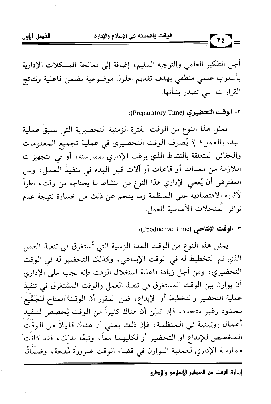 وباختصار يمكن القول في هذا المجال: إن المدير الفعّال هو الذي يعلم كيف يستخدم وقته ويوزعه توزيعًا فاعلاً بين تخطيط الأنشطة المستقبلية (وقت إبداعي) ، وتحديد الأنشطة اللازمة لأدائها (وقت تحضيري) ، وفي صرف الكمية اللازمة من الوقت للقيام بالعمل (وقت إنتاجي) ، وأن يخصص كذلك وقتًا كافيًا للقيام بالمراسلات وبأعباء المسؤولية الاجتماعية (وقت عام) ؛ باعتباره عضوًا في هذا المجتمع، وممثلاً لمنظمة ملتزمة باهتمامات هذا المجتمع، كما أن المجتمع - بالمقابل - ملتزم بها.