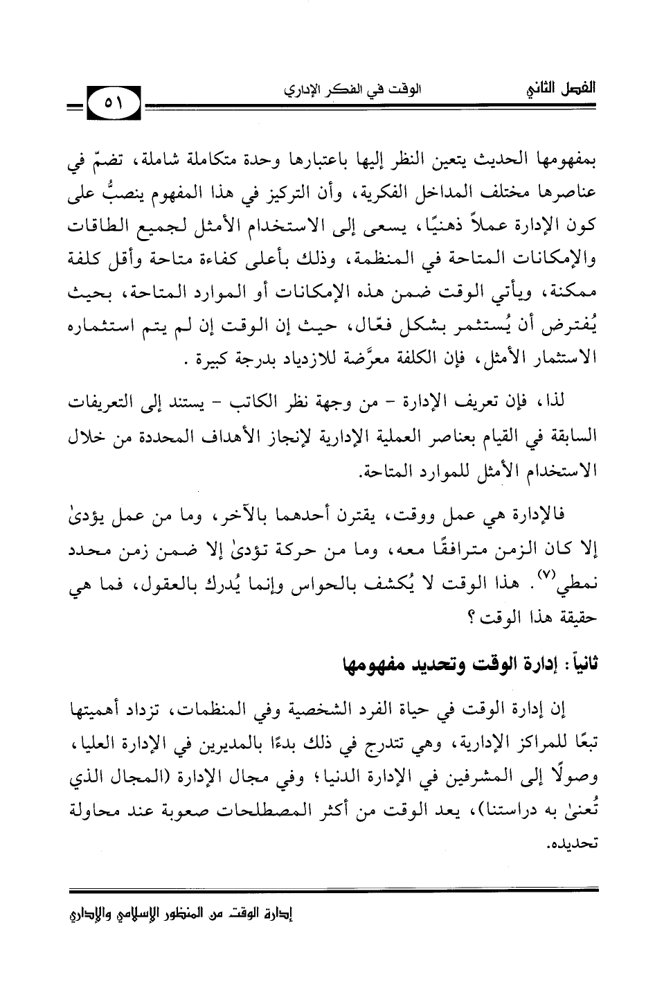 للمهمات الأساسية ووقت أقل للمهمات التافهة" (¬1) . ويرى سهيل سلامة أن إدارة الوقت هي: "استثمار الوقت بشكل فعال لتحقيق الأهداف المحددة في الفترة الزمنية المعينة لذلك" (¬2) . أما عبد العزيز ملائكة فقد حاول في تعريفه الجمع بين كلٍّ من المنظورين الإسلامي والإداري معاً، حيث يعرّف إدارة الوقت بقوله: "هي تخطيط استخدام الوقت وأسلوب استغلاله بفاعلية، لجعل حياتنا منتجة وذات منفعة أخروية ودنيوية لنا ولمن أمكن من حولنا، وبالذات من هم تحت رعايتنا" (¬3) . فإدارة الوقت هي الاستخدام الأفضل للوقت، وللإمكانات المتاحة، وذلك بطريقة تؤدي إلى تحقيق الأهداف. ولن يكون ذلك إلا من خلال الالتزام والتحليل والتخطيط والمتابعة، من أجل الاستفادة من الوقت بشكل أفضل في المستقبل.