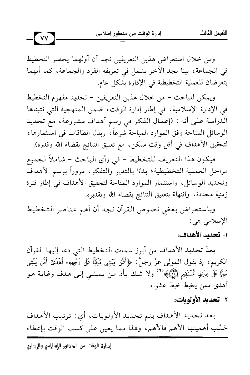 من سمات التخطيط في الإسلام تحديد الأهداف وبذل الأسباب، والتوكل على الله بعد ذلك في تحقيق النتائج وتعليق ذلك بمشيئة الله وتقديره، قال تعالى: {وَلاَ تَقُولَنَّ لِشَيءٍ إِنِّي فَاعِلٌ ذَلِكَ غَدًا * إِلاَّ أَنْ يَشَاءَ اللَّهُ} (¬1) . والخطاب هنا يفيد عموم التوجيه للنبيِّ صلى الله عليه وسلم ولأُمَّته من بعده.