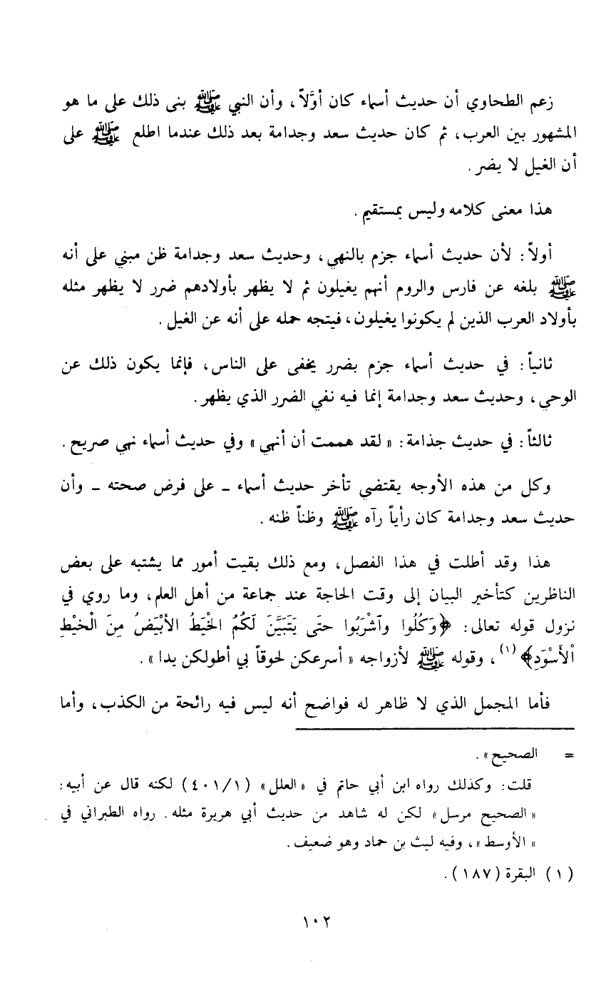 زعم الطحاوي أن حديث أسماء كان أولاً، وأن النبي - صلى الله عليه وسلم - بنى ذلك على ما هو المشهور بين العرب، ثم كان حديث وجدامة بعد ذلك عندما أطلع - صلى الله عليه وسلم - على أن الغيل لا يضر.