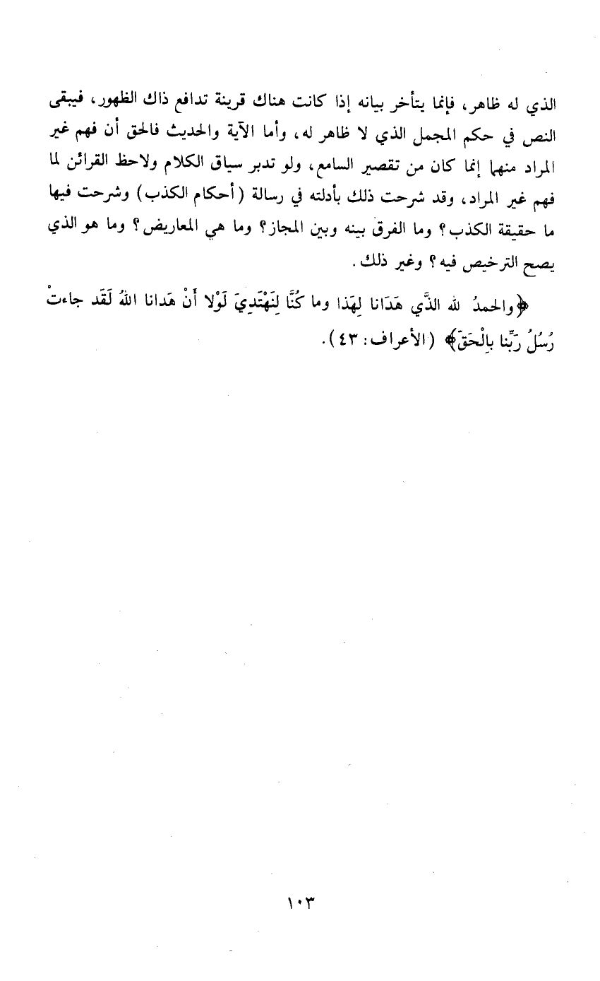 الذي له ظاهر، فإنما يتأخر بيانه إذا كانت هناك قرينة تدافع ذاك الظهور، فيبقى النص في حكم المجمل الذي لا ظاهر له، وأما الآية والحديث فالحق أن فهم غير المراد منهما إنما كان من تقصير السامع، ولو تدبر سياق الكلام ولاحظ القرائن لما فهم غير المراد، وقد شرحت ذلك بأدلته في رسالة (أحكام الكذب) وشرحت فيها ما حقيقة الكذب؟ وما الفرق بينه وبين المجاز؟ وما هي المعاريض؟ وما هو الذي يصح الترخيص فيه؟ وغير ذلك.