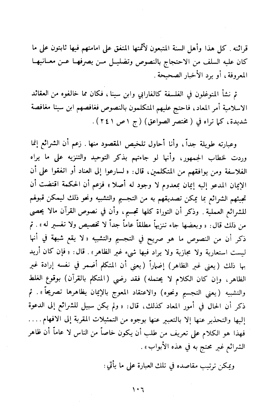 وعباراته طويلة جداً، وأنا أحاول المقصود أحاول تلخيص المقصود منها. زعم أن الشرائع إنما وردت لخطاب الجمهور، أنها لوجائتهم بذكر التوحيد والتنزيه على ما يراه الفلاسفة ومن يوافقهم من المتكلمين، قال: «لسارعوا إلى العناد أو اتفقوا على أن الإيمان المدعو إليه إيمان بمعدوم لا وجود له أصلا» . فزعم أن الحكمة اقتضت أن تجيئهم الشرائع بما يمكن تصديقهم به من التجسيم والتشبيه ونحو ذلك ليمكن قبولهم للشرائع العملية. وذكر أن التوراة كلها تجسيم وأن في نصوص القرآن ما لا يحصى من ذلك قال: «وبعضه جاء تنزيهاً مطلقاً عاماً جداً لا تخصيص ولا تفسير له» . ثم ذكر أن من النصوص ما هو صريح في التجسيم والتشبيه «ولا يقع شبهة في أنها ليست استعارية ولا مجازية ولا يراد فيها شيء غير الظاهر» . قال: «فإن كان أريد بها ذلك (يغني غير الظاهر) إضماراً (يعني أن المتكلم أضمر في نفسه إرادة غير الظاهر، وإن كان الكلام لا يحتمله) فقد رضي (المتكلم بالقرآن) بوقوع الغلط والتشبيه (يعني التجسيم ونحوه) والاعتقاد المعوج بالإيمان يظاهرها تصريحاً» . ثم ذكر أن الحال في أمور المعاد كذلك، قال: «ولم يكن سبيل للشرائع إلى الدعوة إليها والتحذير عنها إلا بالتعبير عنها بوجود من التمثيلات المقربة إلى الأفهام ... فهذا هو الكلام على تعريف من طلب أن يكون خاصاً من الناس لا عاماً أن ظاهر الشرائع غير محتج به في هذه الأبواب» .
