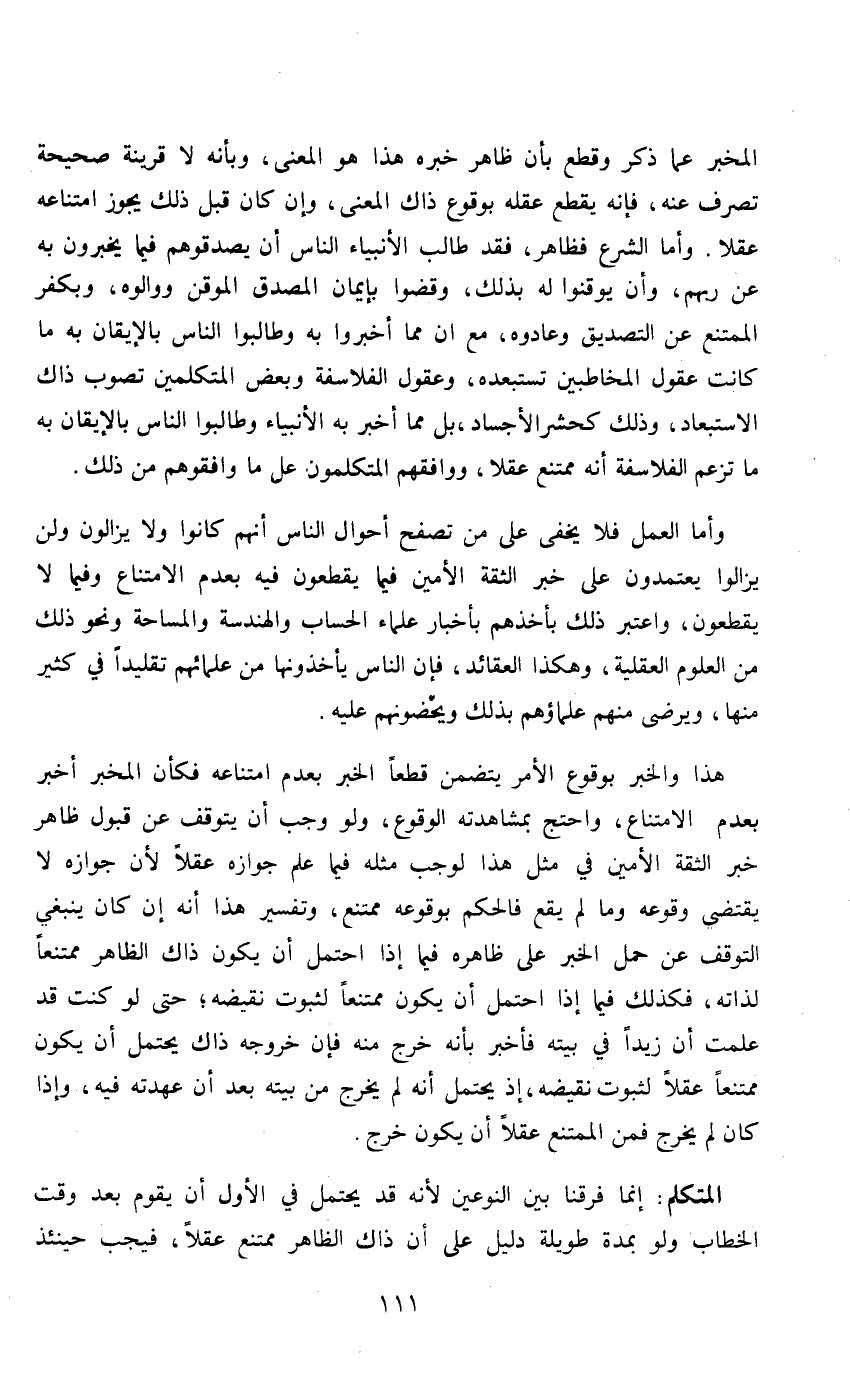 المخبر عما ذكر وقطع بأن ظاهر خبره هذا هو المعنى، وبأنه لا قرينة صحيحة تصرف عنه، فأنه يقطع عقلاً بوقوع ذاك المعنى، وإن كان قبل ذلك يجوز امتناعه عقلاً. وأما الشرع فظاهر، فقد طالب الأنبياء الناس أن يصدقوهم فيما يخبرون به عن ربهم، وأن يوقنوله بذلك، وقضوا بإيمان المصدق الموقن ووالوه، وبكفر الممتنع عن التصديق وعادوه، مع أن مما أخبروا به وطالبوا الناس بالإيقان به ما كانت عقول المخاطبين تستبعده، وعقول الفلاسفة وبعض المتكلمين تصوب ذاك الاستبعاد، وذلك كحشر الأجساد بل مما أخبر به الأنبياء وطالبوا الناس بالإيقان به ما تزعم الفلاسفة أنه ممتنع عقلاً، ووافقهم المتكلمون على ما وافقوهم من ذلك.