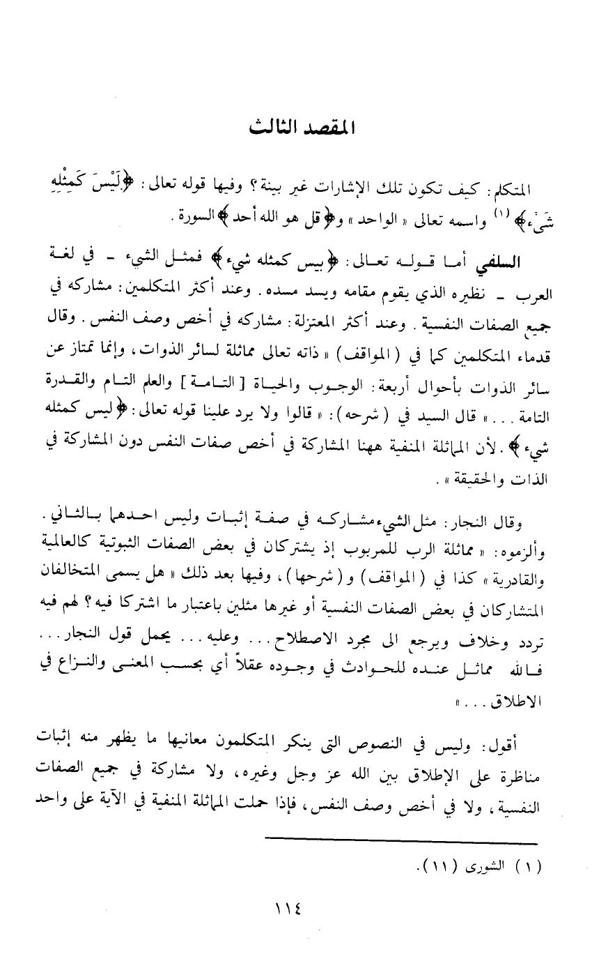السلفي: أما قوله تعالى: «لَيْسَ كَمِثْلِهِ شَيْءٌ» فمثل الشيء - في لغة العرب - نظيره الذي يقوم مقامه ويسد مسده. وعند اكثر المتكلمين: مشاركة في جميع الصفات النفسية. وعند أكثر المعتزلة: مشاركة في أخص وصف النفس. وقال قدماء المتكلمين كما في (المواقف) «ذاته تعالى مماثلة لسائر الذوات، وإنما تمتاز عن سائر الذوات بأحوال أربعة: الوجوب والحياة «التامة» والعلم التام والقدرة التامة ... » قال السيد في (شرحه) : «قالوا ولا يرد علينا قوله تعالى: «لَيْسَ كَمِثْلِهِ شَيْءٌ» . لأن المماثلة المنفية ههنا المشاركة في أخص صفات النفس دون المشاركة في الذات والحقيقة» .